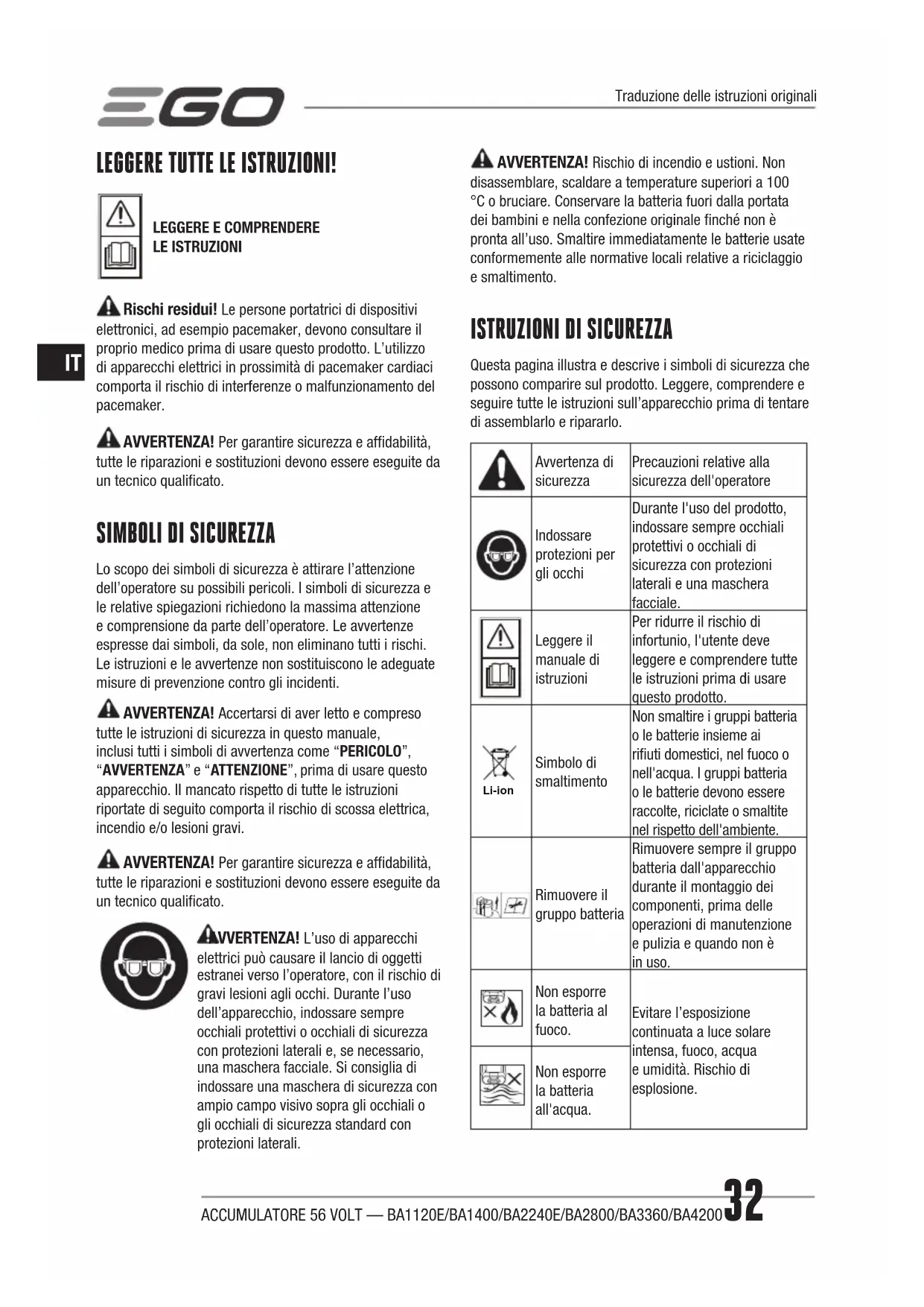 Seguire le istruzioni riportate nel manuale del prodotto EGO specico.ACCUMULATORE 56 VOLT — BA1120E/BA1400/BA2240E/BA2800/BA3360/BA420036