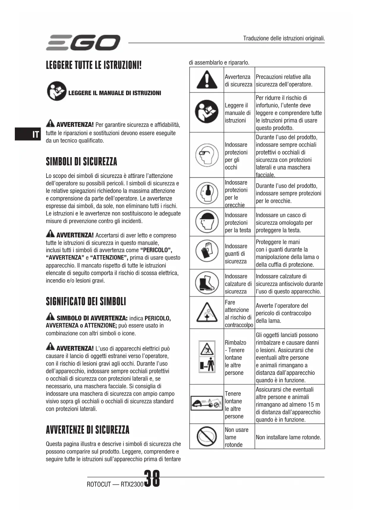 Questa pagina illustra e descrive i simboli di sicurezza che possono comparire sul prodotto. Leggere, comprendere e seguire tutte le istruzioni sull’apparecchio prima di tentare di assemblarlo e ripararlo. Avvertenza di sicurezza Precauzioni relative alla sicurezza dell’operatore. Leggere il manuale di istruzioni Per ridurre il rischio di infortunio, l’utente deve leggere e comprendere tutte le istruzioni prima di usare questo prodotto. Indossare protezioni per gli occhi Durante l’uso del prodotto, indossare sempre occhiali protettivi o occhiali di sicurezza con protezioni laterali e una maschera facciale. Indossare protezioni per le orecchie Durante l’uso del prodotto, indossare sempre protezioni per le orecchie. Indossare protezioni per la testa Indossare un casco di sicurezza omologato per proteggere la testa. Indossare guanti di sicurezza Proteggere le mani con i guanti durante la manipolazione della lama o della cuffia di protezione. Indossare calzature di sicurezza Indossare calzature di sicurezza antiscivolo durante l’uso di questo apparecchio. Fare attenzione al rischio di contraccolpo Avverte l’operatore del pericolo di contraccolpo della lama. Rimbalzo - Tenere lontane le altre persone Gli oggetti lanciati possono rimbalzare e causare danni o lesioni. Assicurarsi che eventuali altre persone e animali rimangano a distanza dall’apparecchio quando è in funzione. 15m Tenere lontane le altre persone Assicurarsi che eventuali altre persone e animali rimangano ad almeno 15 m di distanza dall’apparecchio quando è in funzione. Non usare lame rotonde Non installare lame rotonde. Traduzione delle istruzioni originali.ROTOCUT — RTX2300