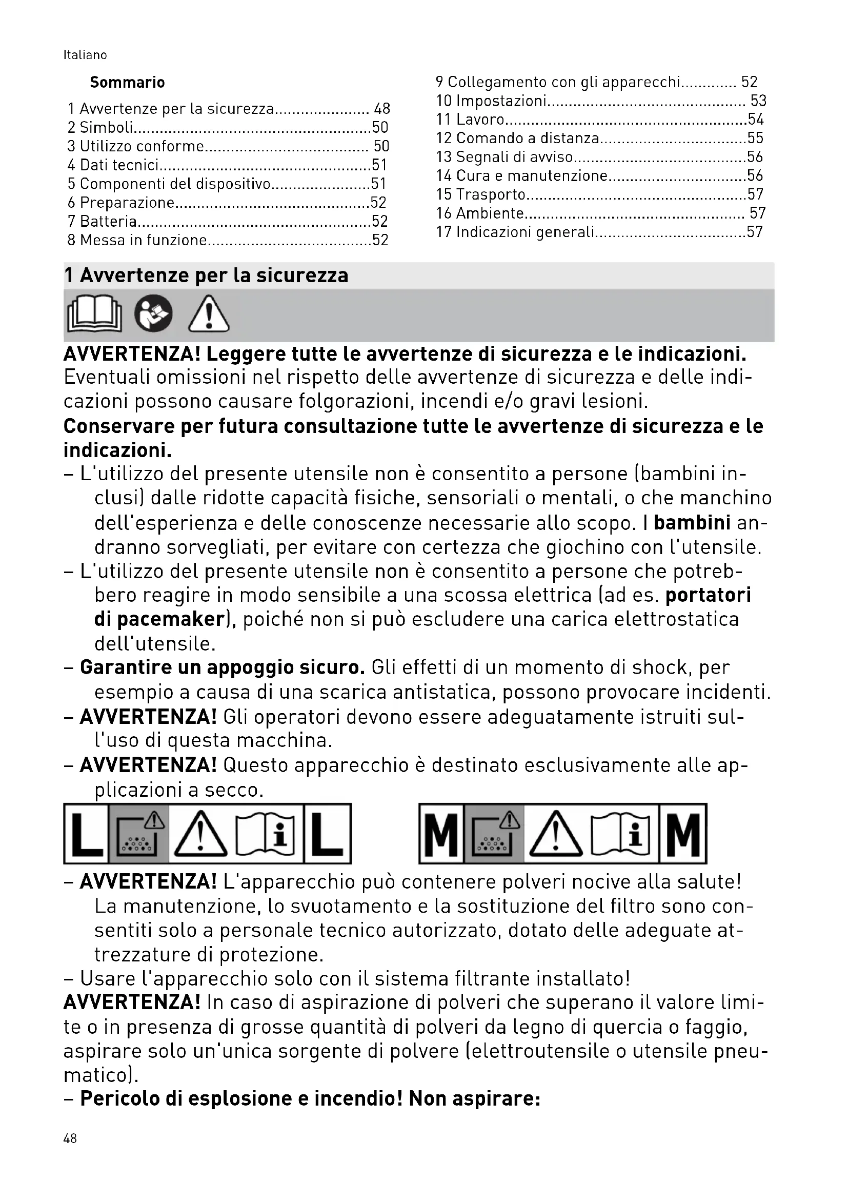 - AVVERTENZA! L'apparecchio può contener polveri nocive alla salute! La manutenzione, lo svuotamento e la sostituzione del filtrro sono consentiti solo a personale technique autorizzato, dotato delle adeguate attrezzature di protezione.