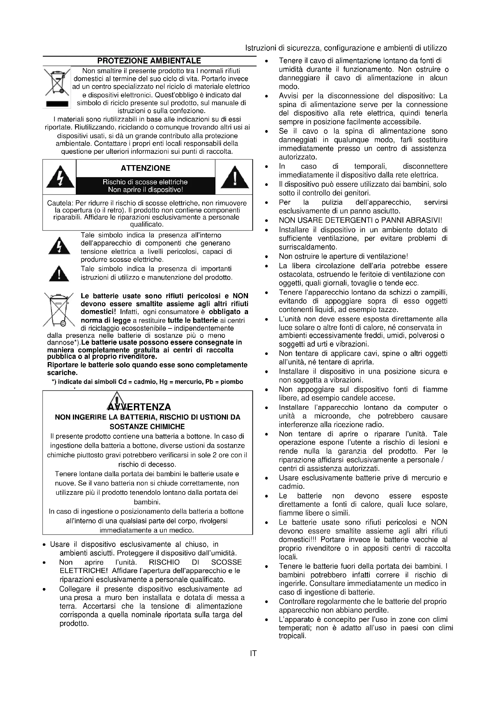AVVERTENZA NON INGERIRE LA BATTERIA, RISCHIO DI USTIONI DA SOSTANZE CHIMICHE Il presente prodotto contiene una batteria a bottone. In caso di ingestione della batteria a bottone, diverse ustioni da sostanze chimiche piuttosto gravi potrebbero verificarsi in sole 2 ore con il rischio di decesso. Tenere lontane dalla portata dei bambini le batterie usate e nuove. Se il vano batteria non si chiude correttamente, non utilizzare più il prodotto tenendolo lontano dalla portata dei bambini. In caso di ingestione o posizionamento della batteria a bottone all’interno di una qualsiasi parte del corpo, rivolgersi immediatamente a un medico.