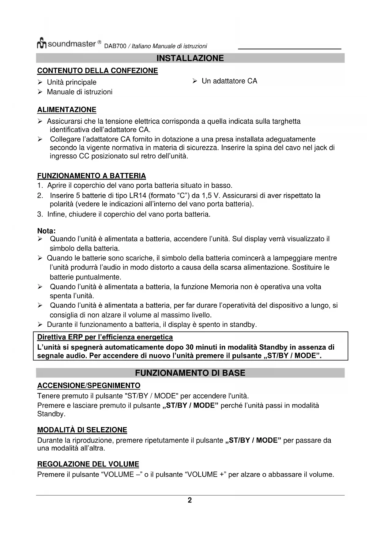 Nota: ➢ Quando l’unità è alimentata a batteria, accendere l’unità. Sul display verrà visualizzato il simbolo della batteria. ➢ Quando le batterie sono scariche, il simbolo della batteria comincerà a lampeggiare mentre l’unità produrrà l’audio in modo distorto a causa della scarsa alimentazione. Sostituire le batterie puntualmente. ➢ Quando l’unità è alimentata a batteria, la funzione Memoria non è operativa una volta spenta l’unità. ➢ Quando l’unità è alimentata a batteria, per far durare l’operatività del dispositivo a lungo, si consiglia di non alzare il volume al massimo livello. ➢ Durante il funzionamento a batteria, il display è spento in standby. Direttiva ERP per l’efficienza energetica L’unità si spegnerà automaticamente dopo 30 minuti in modalità Standby in assenza di segnale audio. Per accendere di nuovo l’unità premere il pulsante „ST/BY / MODE”.