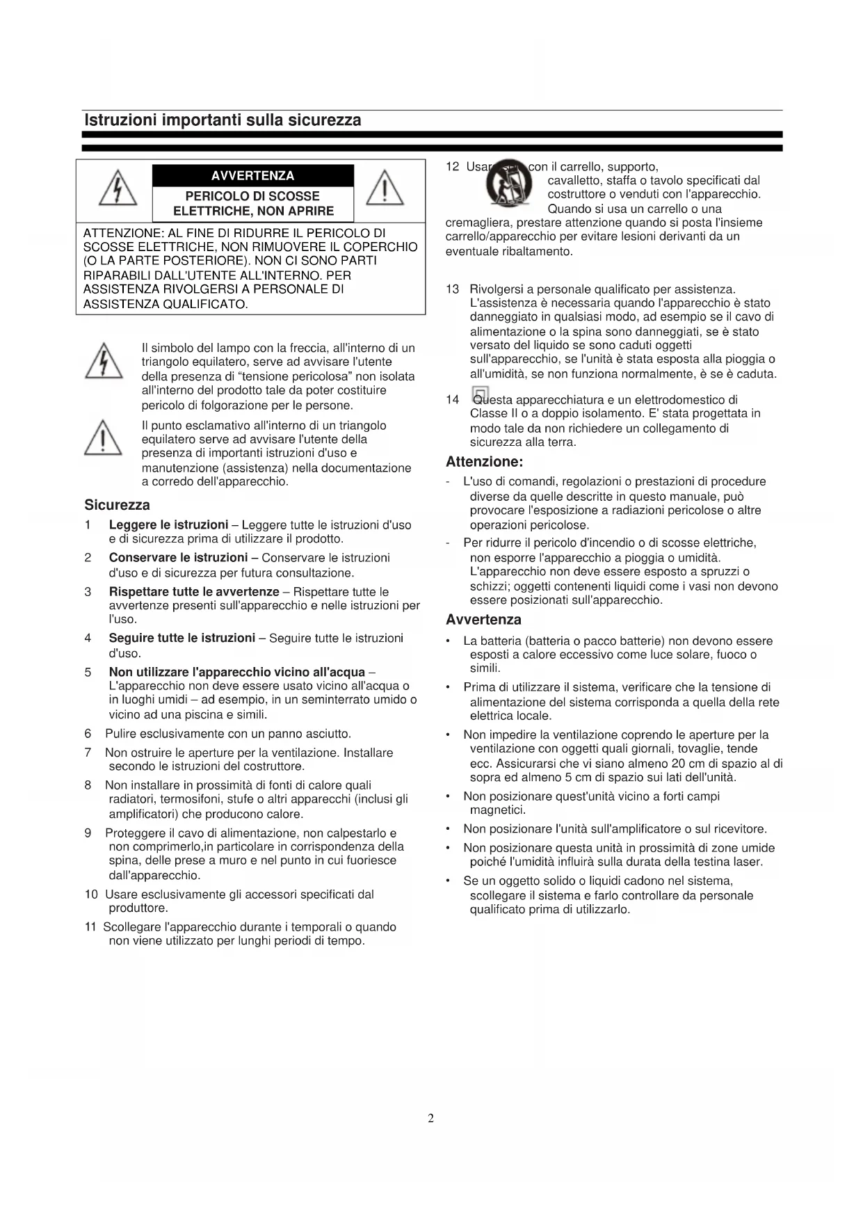 12 Usare solo con il carrello, supporto, cavalletto, staffa o tavolo specificati dal costruttore o venduti con l'apparecchio. Quando si usa un carrello o una cremagliera, prestare attenzione quando si posta l'insieme carrello/apparecchio per evitare lesioni derivanti da un eventuale ribaltamento. 13 Rivolgersi a personale qualificato per assistenza. L'assistenza è necessaria quando l'apparecchio è stato danneggiato in qualsiasi modo, ad esempio se il cavo di alimentazione o la spina sono danneggiati, se è stato versato del liquido se sono caduti oggetti sull'apparecchio, se l'unità è stata esposta alla pioggia o all'umidità, se non funziona normalmente, è se è caduta. 14 Questa apparecchiatura e un elettrodomestico di Classe II o a doppio isolamento. E' stata progettata in modo tale da non richiedere un collegamento di sicurezza alla terra. Attenzione: - L'uso di comandi, regolazioni o prestazioni di procedure diverse da quelle descritte in questo manuale, può provocare l'esposizione a radiazioni pericolose o altre operazioni pericolose. - Per ridurre il pericolo d'incendio o di scosse elettriche, non esporre l'apparecchio a pioggia o umidità. L'apparecchio non deve essere esposto a spruzzi o schizzi; oggetti contenenti liquidi come i vasi non devono essere posizionati sull'apparecchio. Avvertenza