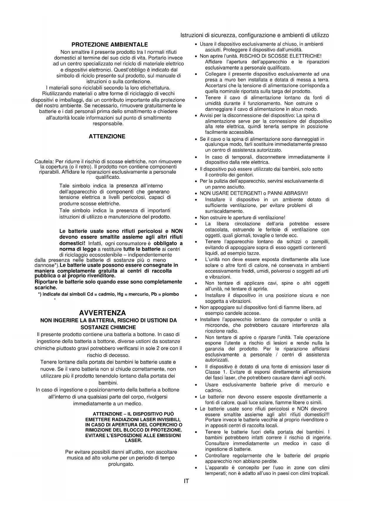 AVVERTENZA NON INGERIRE LA BATTERIA, RISCHIO DI USTIONI DA SOSTANZE CHIMICHE Il presente prodotto contiene una batteria a bottone. In caso di ingestione della batteria a bottone, diverse ustioni da sostanze chimiche piuttosto gravi potrebbero verificarsi in sole 2 ore con il rischio di decesso. Tenere lontane dalla portata dei bambini le batterie usate e nuove. Se il vano batteria non si chiude correttamente, non utilizzare più il prodotto tenendolo lontano dalla portata dei bambini. In caso di ingestione o posizionamento della batteria a bottone all’interno di una qualsiasi parte del corpo, rivolgersi immediatamente a un medico.