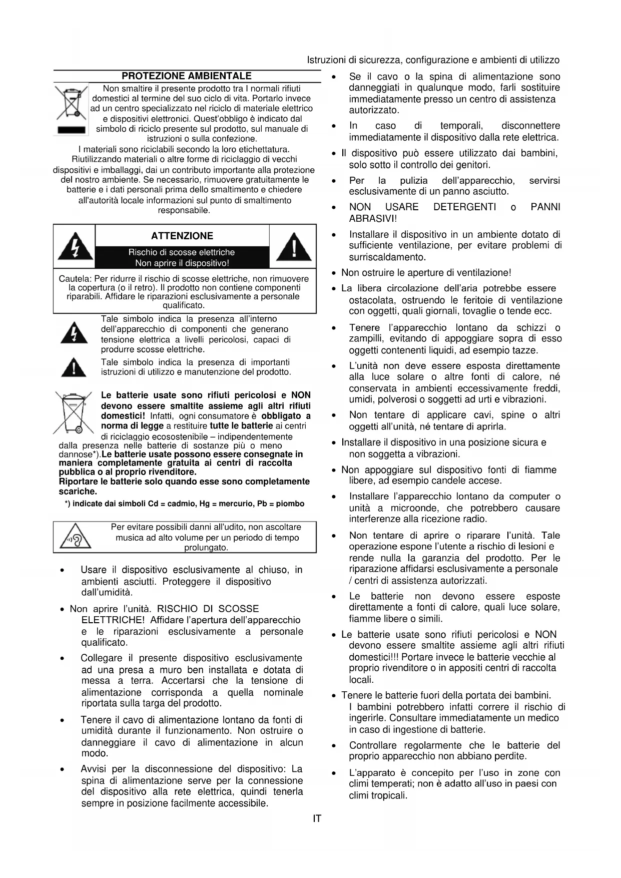 Nota: ➢ Quando le batterie sono scariche, sul display comparirà “Battery low”. Sostituire le batterie puntualmente. ➢ Quando l’unità viene alimentata dalle batterie, al fine di allungarne i tempi di operatività, si consiglia di non impostare il volume al livello massimo. ➢ Se il dispositivo è alimentato a batteria, il consumo di questo tipo di alimentazione continuerà anche in modalità Standby. Per evitare tale consumo, suggeriamo la rimozione delle batterie o il collegamento del dispositivo alla rete elettrica.