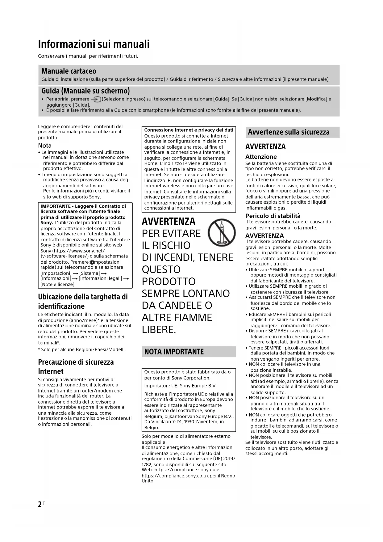ALTRE FIAMME LIBERE. Solo per modello di alimentatore esterno applicabile:Il consumo energetico e altre informazioni di alimentazione, come richiesto dal regolamento della Commissione (UE) 2019/1782, sono disponibili sul seguente sito Web: https://compliance.sony.eu e https://compliance.sony.co.uk per il Regno Unito AVVERTENZA Attenzione Se la batteria viene sostituita con una di tipo non corretto, potrebbe verificarsi il rischio di esplosioni.Le batterie non devono essere esposte a fonti di calore eccessivo, quali luce solare, fuoco o simili oppure ad una pressione dell’aria estremamente bassa, che può causare esplosioni o perdite di liquidi infiammabili o gas. Pericolo di stabilità Il televisore potrebbe cadere, causando gravi lesioni personali o la morte. AVVERTENZA Il televisore potrebbe cadere, causando gravi lesioni personali o la morte. Molte lesioni, in particolare ai bambini, possono essere evitate adottando semplici precauzioni, tra cui:• Utilizzare SEMPRE mobili o supporti oppure metodi di montaggio consigliati dal fabbricante del televisore.• Utilizzare SEMPRE mobili in grado di sostenere con sicurezza il televisore.• Assicurarsi SEMPRE che il televisore non fuoriesca dal bordo del mobile che lo sostiene.• Educare SEMPRE i bambini sui pericoli impliciti nel salire sui mobili per raggiungere i comandi del televisore.• Disporre SEMPRE i cavi collegati al televisore in modo che non possano essere calpestati, tirati o afferrati.• Tenere SEMPRE i piccoli accessori fuori dalla portata dei bambini, in modo che non vengano ingeriti per errore.• NON collocare il televisore in una posizione instabile.• NON posizionare il televisore su mobili alti (ad esempio, armadi o librerie), senza ancorare il mobile e il televisore ad un solido supporto.• NON posizionare il televisore su un panno o altri materiali situati tra il televisore e il mobile che lo sostiene.• NON collocare oggetti che potrebbero indurre i bambini ad arrampicarsi, come giocattoli e telecomandi, sul televisore o sui mobili su cui è posizionato il televisore.Se il televisore sostituito viene riutilizzato e collocato in un altro posto, adottare gli stessi accorgimenti. Informazioni sui manuali Conservare i manuali per riferimenti futuri. Manuale cartaceo Guida di installazione (sulla parte superiore del prodotto) / Guida di riferimento / Sicurezza e altre informazioni (il presente manuale). Guida (Manuale su schermo)