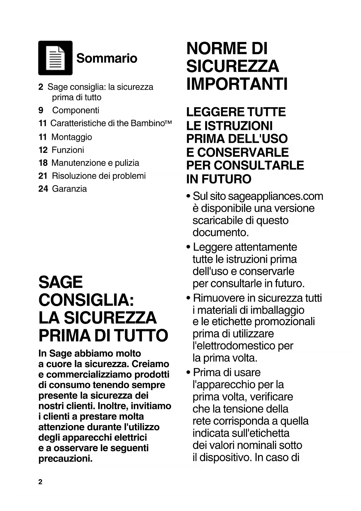 - Prima di usare l'apparecchio per la prima volta, vericare che la tensione della rete corrisponda a quella indicata sull'etichetta dei valori nominali sotto il dispositivo. In caso di Sommario 2 Sage consiglia: la sicurezza prima di tutto9 Componenti11 Caratteristiche di the Bambino 11 Montaggio12 Funzioni18 Manutenzione e pulizia21 Risoluzione dei problemi24 Garanzia3