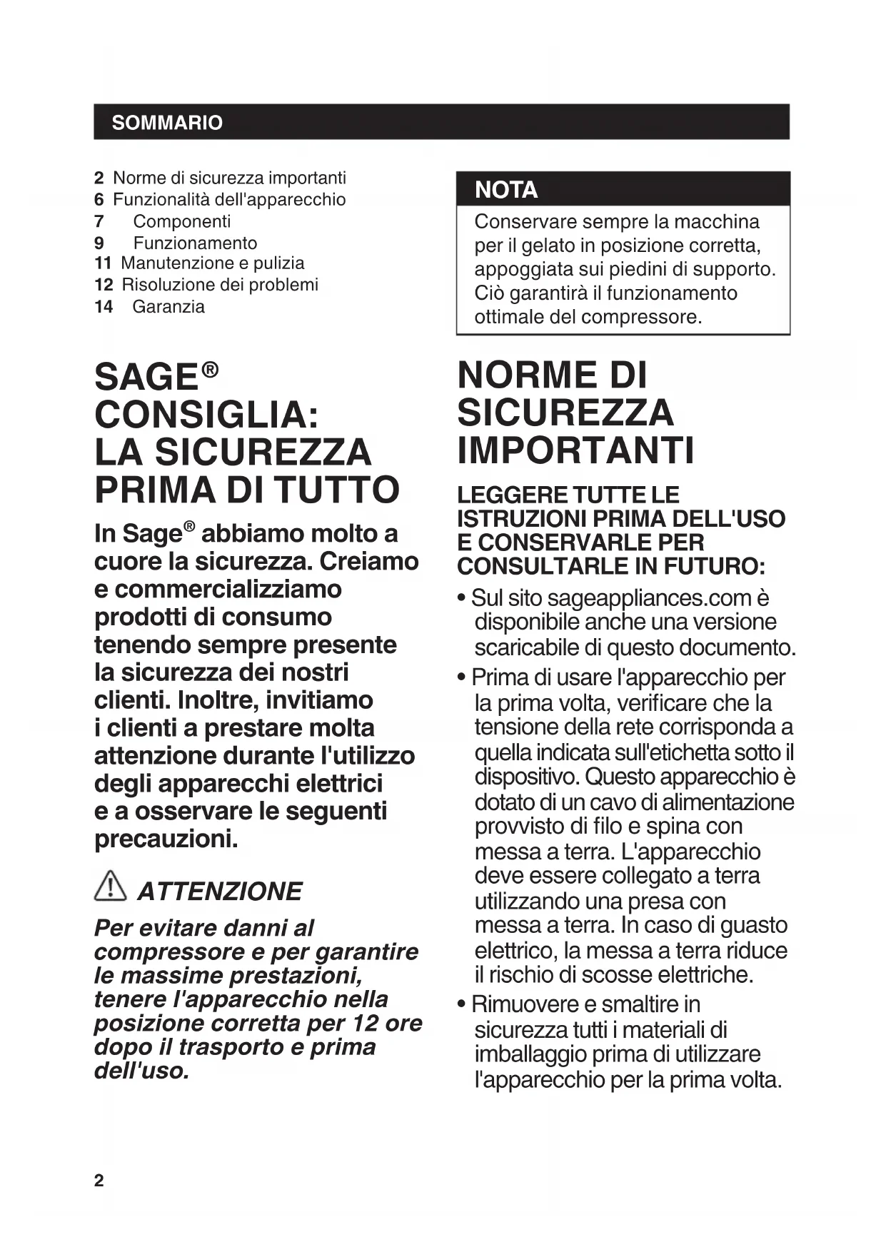 SOMMARIO 2 Norme di sicurezza importanti6 Funzionalità dell'apparecchio7 Componenti9 Funzionamento11 Manutenzione e pulizia12 Risoluzione dei problemi14 Garanzia SAGE