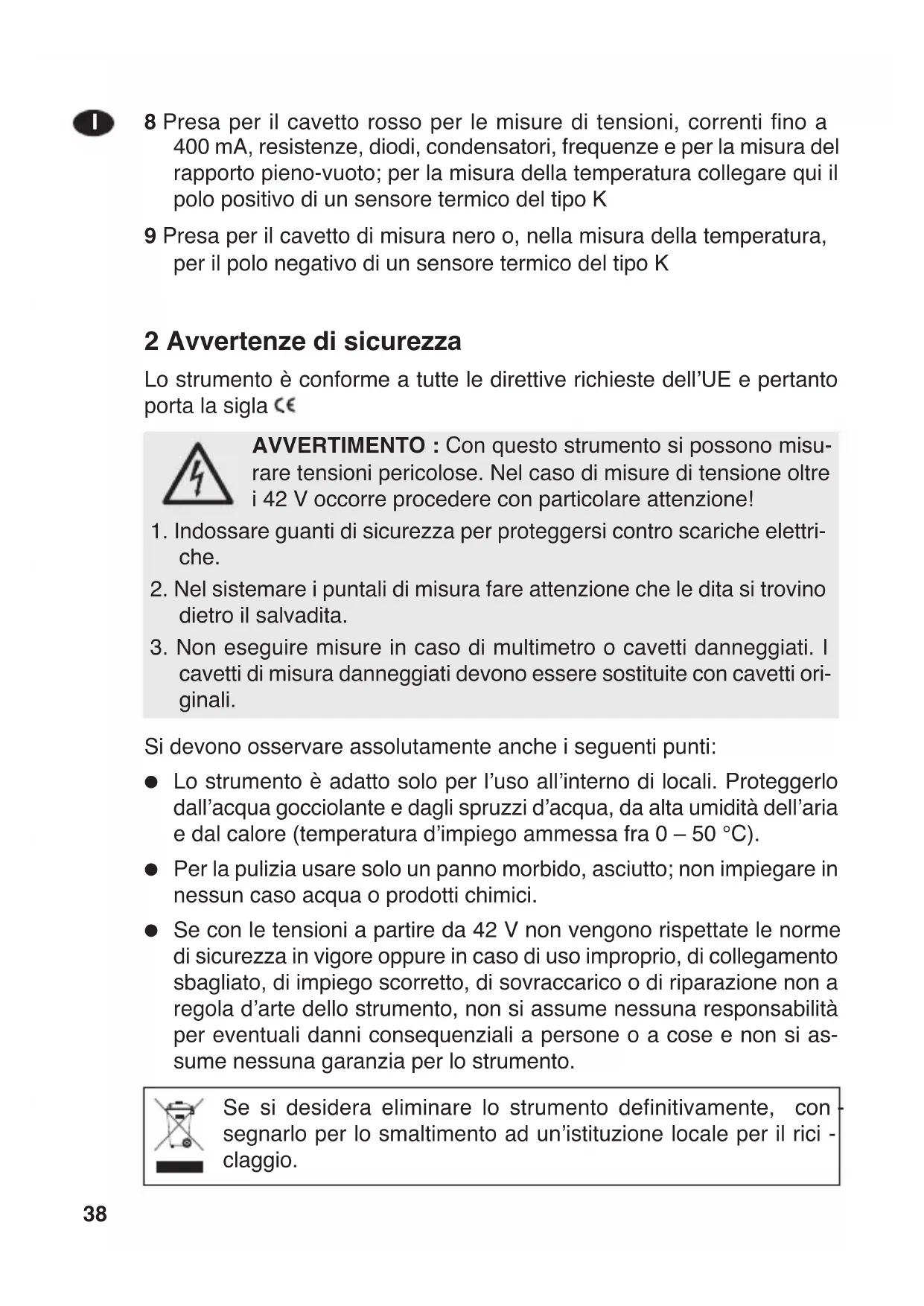 Se con le tensioni a partire da 42 V non vengono rispettate le norme di sicurezza in vigore oppure in caso di uso improprio, di collegamento sbagliato, di impiego scorretto, di sovraccarico o di riparazione non a regola dʼarte dello strumento, non si assume nessuna responsabilità per eventuali danni consequenziali a persone o a cose e non si as- sume nessuna garanzia per lo strumento. Se si desidera eliminare lo strumento definitivamente, con - segnarlo per lo smaltimento ad unʼistituzione locale per il rici - claggio. AVVERTIMENTO : Con questo strumento si possono misu- rare tensioni pericolose. Nel caso di misure di tensione oltre i 42 V occorre procedere con particolare attenzione!