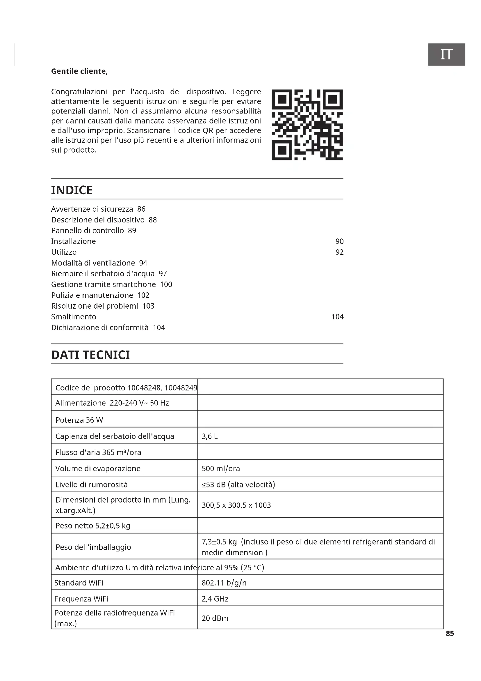Gentile cliente, Congratulazioni per l'acquisto del dispositivo. Leggere attentamente le seguenti istruzioni e seguirle per evitare potenziali danni. Non ci assumiamo alcuna responsabilità per danni causati dalla mancata osservanza delle istruzioni e dall'uso improprio. Scansionare il codice QR per accedere alle istruzioni per l'uso più recenti e a ulteriori informazioni sul prodotto. INDICE DATI TECNICI Codice del prodotto 10048248, 10048249 Alimentazione 220-240 V~ 50 Hz Potenza 36 W Capienza del serbatoio dell'acqua 3,6 L Flusso d'aria 365 m³/ora Volume di evaporazione 500 ml/ora Livello di rumorosità ≤53dB(altavelocità) Dimensionidelprodottoinmm(Lung. xLarg.xAlt.) 300,5x300,5x1003 Peso netto 5,2±0,5 kg Peso dell'imballaggio 7,3±0,5kg(inclusoilpesodidueelementirefrigerantistandarddi mediedimensioni) Ambiente d'utilizzo Umiditàrelativainferioreal95%(25°C) Standard WiFi