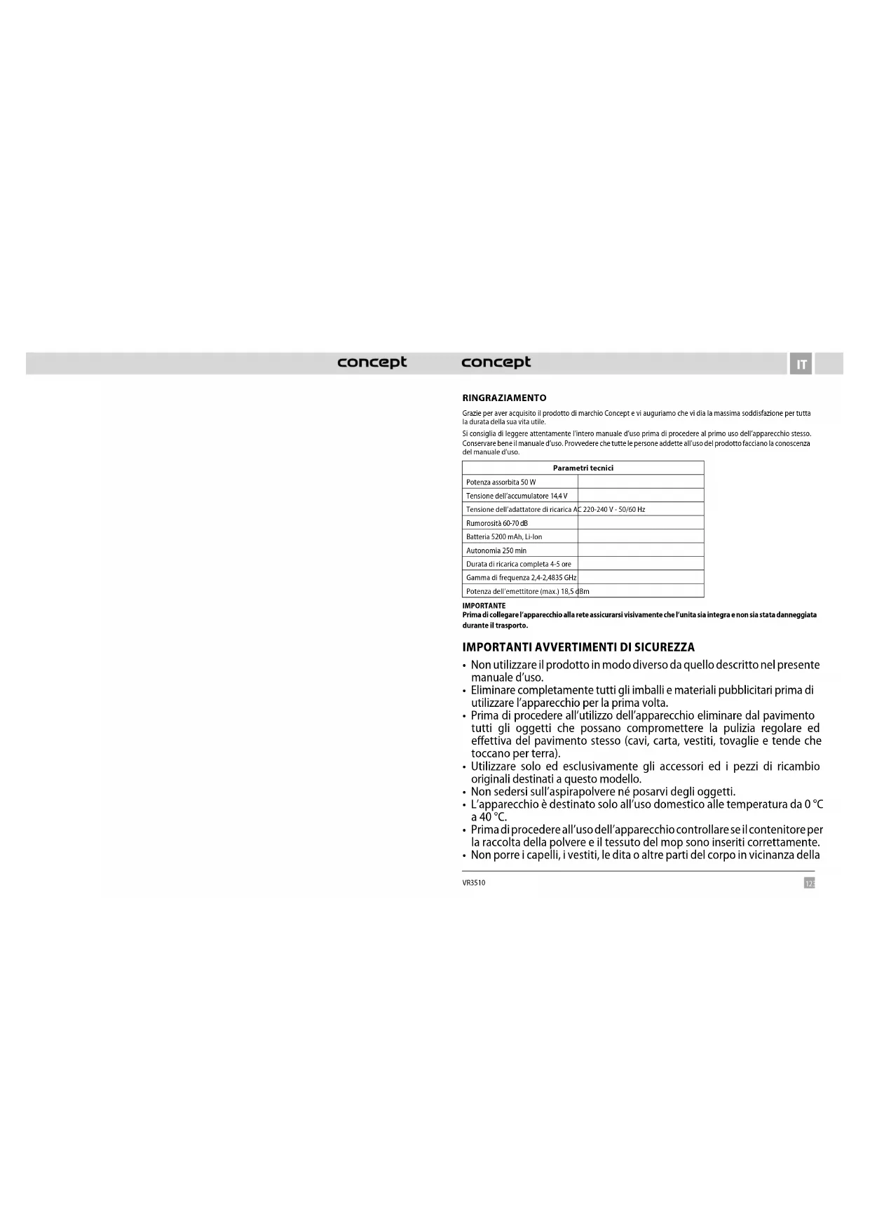 VR3510 RINGRAZIAMENTO Grazie per aver acquisito il prodotto di marchio Concept e vi auguriamo che vi dia la massima soddisfazione per tutta la durata della sua vita utile. Si consiglia di leggere attentamente l’intero manuale d’uso prima di procedere al primo uso dell’apparecchio stesso. Conservare bene il manuale d’uso. Provvedere che tutte le persone addette all’uso del prodotto facciano la conoscenza del manuale d’uso. Parametri tecnici Potenza assorbita 50 W Tensione dell’accumulatore 14,4 V Tensione dell’adattatore di ricarica AC 220-240 V - 50/60 Hz Rumorosità 60-70 dB Batteria 5200 mAh, Li-Ion Autonomia 250 min Durata di ricarica completa 4-5 ore Gamma di frequenza 2,4-2,4835 GHz Potenza dell’emettitore (max.) 18,5 dBm IMPORTANTE Prima di collegare l’apparecchio alla rete assicurarsi visivamente che l’unita sia integra e non sia stata danneggiata durante il trasporto.
