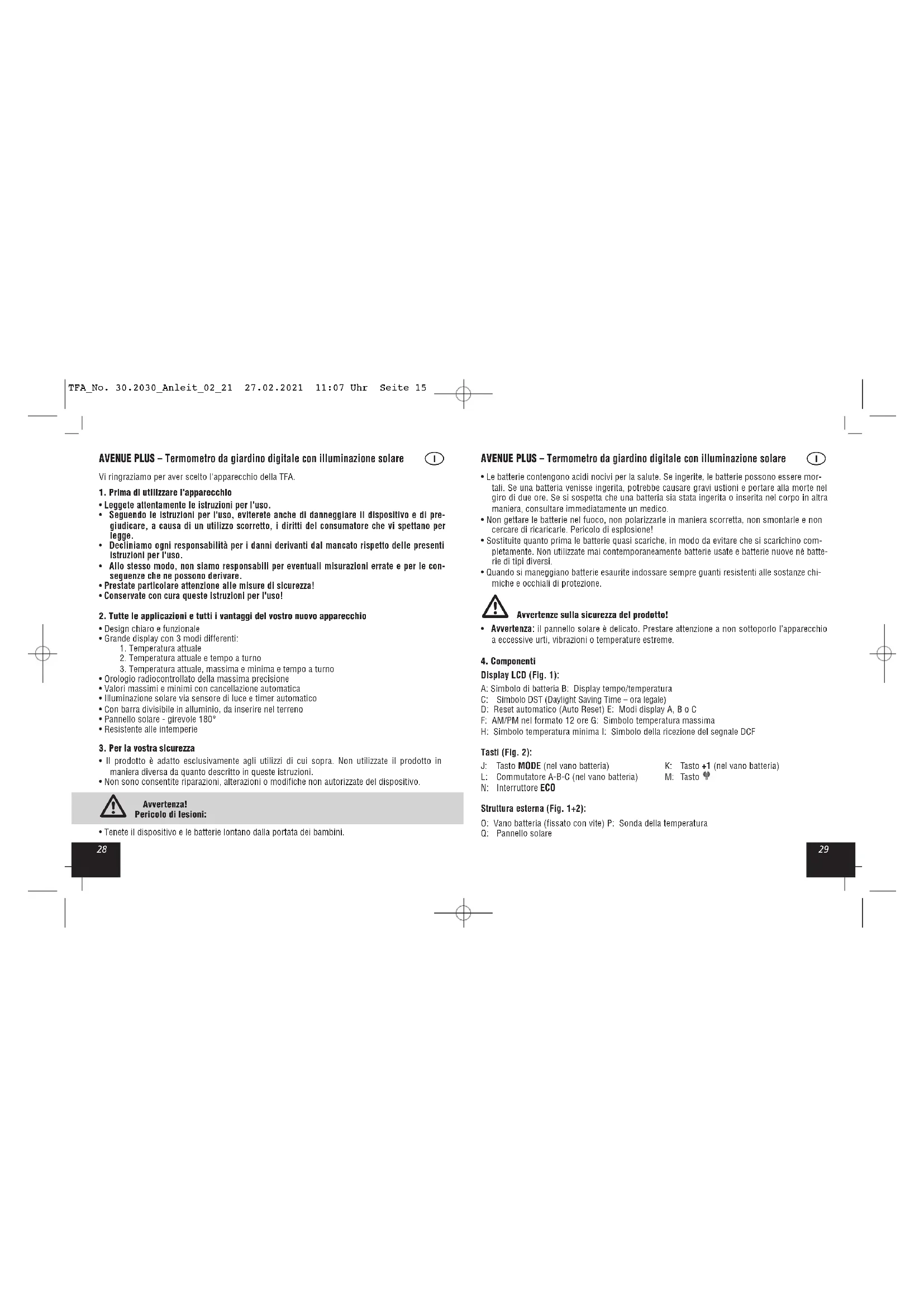 Questo prodotto è stato realizzato utilizzando materiali e componenti di alta qualità che possono essere riciclati e riutilizzati. È assolutamente vietato gettate le batterie tra i rifiuti domestici. In qualità di consumatori, siete tenuti per legge a consegnare le batterie usate al negoziante o ad altri enti preposti al riciclaggio in conformità alle vigenti disposi- zioni nazionali o locali, ai fini di uno smaltimento ecologico. Le sigle dei metalli pesanti contenuti sono: Cd=cadmio, Hg=mercurio, Pb=piombo Questo apparecchio è etichettato in conformità alla Direttiva UE sullo smaltimen- to delle apparecchiature elettriche ed elettroniche (WEEE). Questo prodotto non deve essere smaltito insieme ai rifiuti domestici. Il consuma- tore è tenuto a consegnare il vecchio apparecchio presso un punto di raccolta per lo smaltimento di apparecchiature elettriche ed elettroniche ai fini di uno smalti- mento ecologico. TFA_No. 30.2030_Anleit_02_21 27.02.2021 11:07 Uhr Seite 18AVENUE PLUS – Digitale tuinthermometer met zonneverlichting