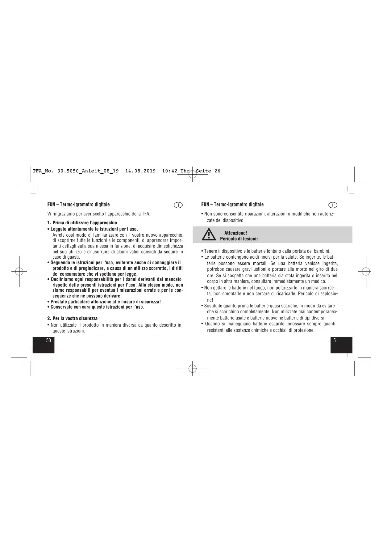 Questo prodotto è stato realizzato utilizzando materiali e componenti di alta qualità che possono essere riciclati e riutilizzati. È assolutamente vietato gettate le batterie tra i rifiuti domestici. In qualità di consumatori, siete tenuti per legge a conse- gnare le batterie usate al negoziante o ad altri enti prepo- sti al riciclaggio in conformità alle vigenti disposizioni nazionali o locali, ai fini di uno smaltimento ecologico. TFA_No. 30.5050_Anleit_08_19 14.08.2019 10:42 Uhr Seite 326564 FUN – Termo-igrometro digitale