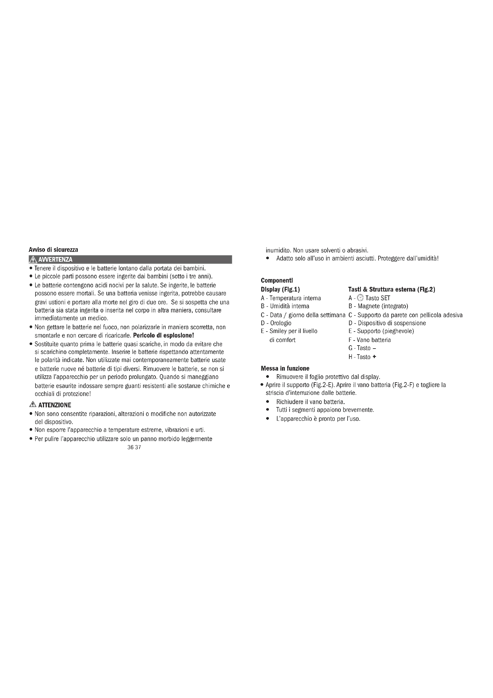 - Aprire il vano batteria (Fig.2-F) e insere due batterie nuove tipo CR2032, polo + verso l'alto.
