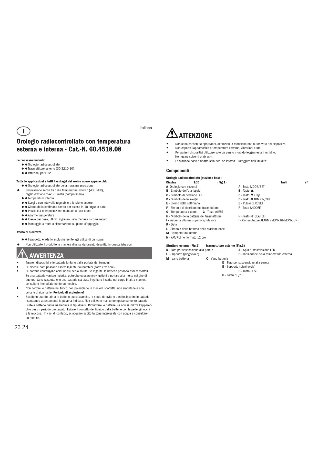 ATTENZIONE y Non sono consentite riparazioni, alterazioni o modiche non autorizzate dei dispositivi. y Non esporre l’apparecchio a temperature estreme, vibrazioni e urti. y Per pulire i dispositivi utilizzare solo un panno morbido leggermente inumidito. Non usare solventi o abrasivi. y La stazione base è adatta solo per uso interno. Proteggere dall’umidità! Componenti: Orologio radiocontrollato (stazione base) Display LCD (Fig.1) Tasti (Fig.2) A -Orologio con secondi A - Tasto MODE/SET B - Simbolo dell’ora legale B - Tasto C - Simbolo di ricezione DCF C - Tasto / D - Simbolo della sveglia D - Tasto ALARM ON/OFF E - Giorno della settimana E - Pulsante RESET F - Simbolo di ricezione del trasmettitore F - Tasto SNOOZE G - Temperatura esterna G - Tasto ALERT H - Simbolo della batteria del trasmettitore H - Tasto RF SEARCH I - Valore di allarme superiore/inferiore I - Commutatore ALARM (MON-FRI/MON-SUN) K - Data L - Simbolo della batteria della stazione base M - Temperatura interna N - AM/PM nel formato 12 ore Struttura esterna (Fig.2) Trasmettitore esterno (Fig.3) K - Foro per sospensione alla parete A - Spia di trasmissione LED L - Supporto (pieghevole) B - Indicazione della temperatura esterna M - Vano batteria C - Vano batteria D - Foro per sospensione alla parete E - Supporto (pieghevole) F - Tasto RESET G - Tasto °C/°F1. Messa in funzione Inserire le batterie Aprire il vano batteria (Fig.2-M) della stazione base e inserire quattro batterie nuove tipo AA da 1,5 V, rispettando le corrette polarità. Viene emesso un segnale acustico e tutti i segmenti appaiono brevemente. Richiudere il coperchio. Aprire il vano batteria (Fig.3-C) e inserire due batterie nuove tipo AAA da 1,5 V, rispettando le corrette polarità. La spia di trasmissione (Fig.3-A) si accende brevemente. Viene visualizzata la temperatura ester- na. Premendo il tasto °C/°F nel vano batteria (Fig.3-G) del trasmettitore è possibile scegliere fra la visualizzazione della temperatura in gradi °C (gradi Celsius) o °F (gradi Fahrenheit). Richiudere il coperchio. Ricezione di valori esterni La stazione base inizia a ricevere la temperatura esterna e il simbolo della ricezione (Fig.1-F) inizia a lampeggiare. Se non si riceve la temperatura esterna (Fig.1-G), sul display della stazione base viene visualizzato “- -. -“. Controllare le batterie e riprovare di nuovo. È successivamente possibile avviare anche manualmente la ricerca del segnale del trasmettitore (ad esempio in caso di perdita del segnale o di sostituzione della batteria). Tenere premuto il tasto RF SEARCH (Fig.2-H) della stazione base per tre secondi. Premere il tasto RESET (Fig.3-F) nel vano batteria del trasmettitore. Ricezione dell’ora radiocontrollata L’orologio inizia a ricevere il segnale radio e il simbolo della ricezione del segnale DCF (Fig.1-C) inizia a lampeggiare. Se il codice dell’ora è stato ricevuto dopo alcuni minuti, l’ora radiocon- trollata e il simbolo della ricezione del segnale DCF sono costantemente visualizzati sul display. Durante il periodo di ora legale sul display appare DST (Fig.1-B). In caso di mancata ricezione del segnale, è possibile avviare l’inizializzazione manualmente. Tenere premuto per tre secondi il tasto / (Fig.2-C). Il simbolo della ricezione del segnale DCF (Fig.1-C) lampeggia. Interrompere l’operazione di ricezione tenendo premuto nuovamente il tasto / per tre secondi. Il simbolo della ricezione del segnale DCF scompare. La ricezione del segnale DCF avviene sempre a 3.00 del mattino. Nel caso in cui l’orologio non riesca a ricevere il segnale DCF (a causa di guasti, della distanza di trasmissione, ecc.), l’ora può essere impostata manualmente. lampeggiante Ricezione attiva si ferma Ricezione molto buona scompare Nessuna ricezione