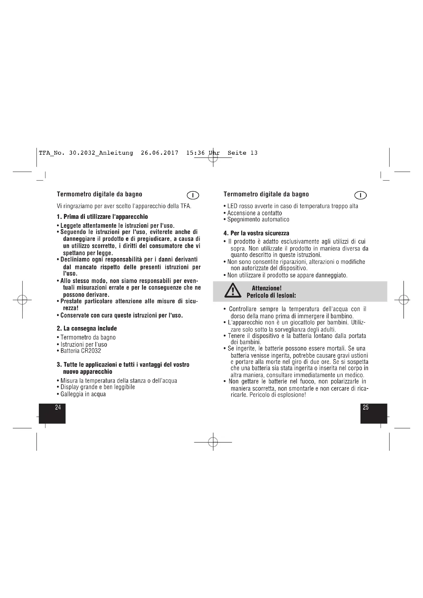 - Non gettare le batterie nel fuoco, non polarizzarle in maniera scorretta, non smontarle e non cercare di rica- ricarle. Pericolo di esplosione! TFA_No. 30.2032_Anleitung 26.06.2017 15:36 Uhr Seite 132726 Termometro digitale da bagno