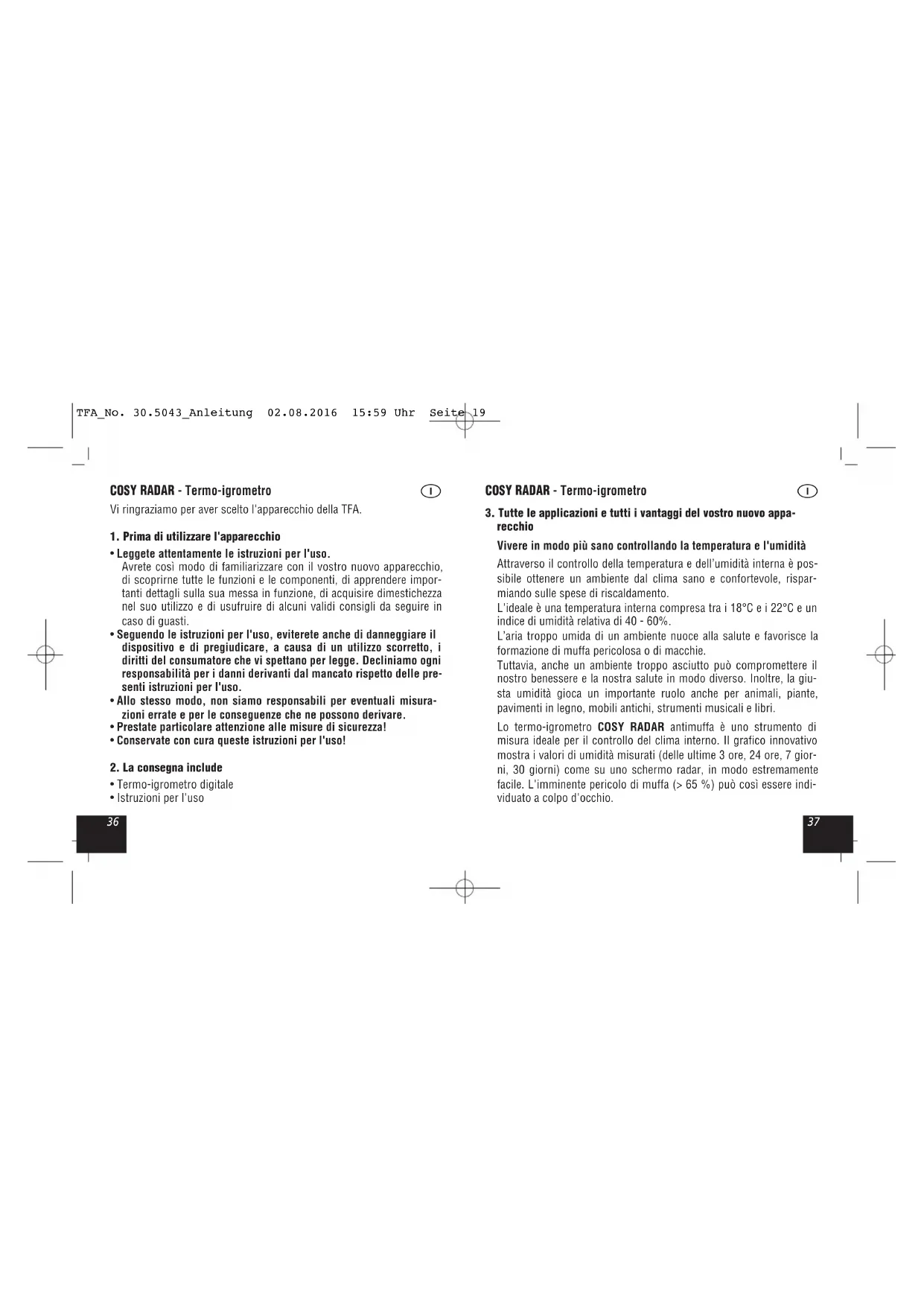 - Non gettare le batterie nel fuoco, non polarizzarle in maniera scorretta, non smontarle e non cercare di ricaricarle. Pericolo di esplosione! TFA_No. 30.5043_Anleitung 02.08.2016 15:59 Uhr Seite 204140 COSY RADAR - Termo-igrometro