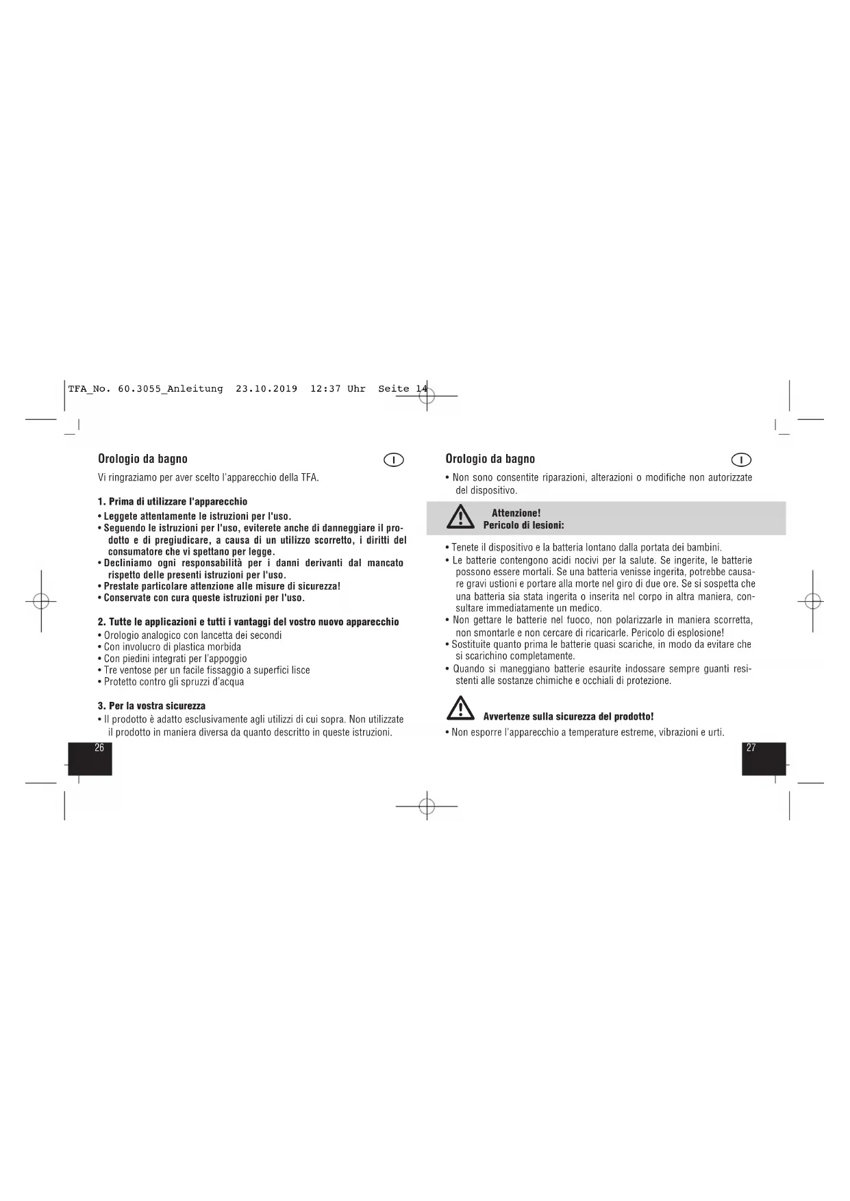 Alimentazione Batteria 1 x AA da 1,5 V (non fornita) Utilizzare batterie alcaline Classe di protezione IPX4 Dimensioni esterne Ø 102 x 55 mm Peso 167 g (solo apparecchio) È vietata la pubblicazione delle presenti istruzioni o di parti di esse senza una prece- dente autorizzazione della TFA Dostmann. I dati tecnici corrispondono allo stato del prodotto al momento della stampa e possono cambiare senza preavviso. È possibile trovare dati tecnici e informazioni aggiornate sul prodotto inserendo il numero di arti- colo sul nostro sito. www.tfa-dostmann.de TFA Dostmann GmbH & Co.KG Zum Ottersberg 12, D-97877 Wertheim, Germania 10/19 TFA_No. 60.3055_Anleitung 23.10.2019 12:37 Uhr Seite 163332 Badkamerklok