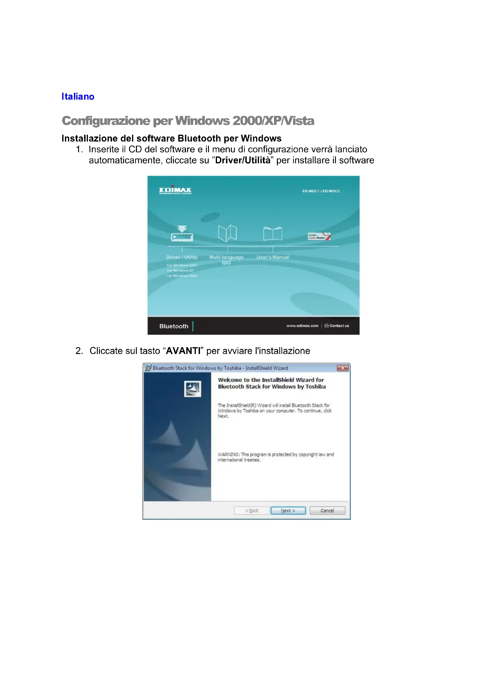 Configurazione per Windows 2000/XP/Vista Installazione del software Bluetooth per Windows