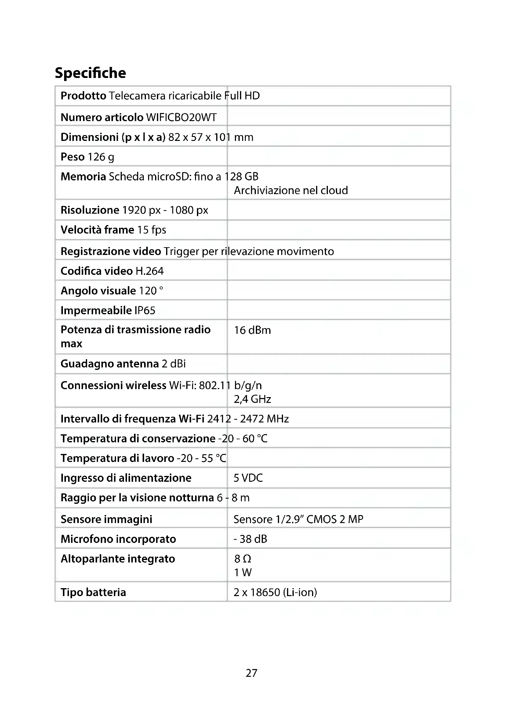 Guida rapida all’avvio Telecamera ricaricabile Full HD WIFICBO20WT Per maggiori informazioni vedere il manuale esteso online: ned.is/wicbo20wt Uso previsto Il prodotto è inteso come telecamera di sicurezza IP per l’utilizzo in ambienti interni ed esterni. Consultare le normative e i regolamenti locali relativi alle telecamere di sicurezza prima dell’uso e dell’installazione. Il prodotto non è inteso per utilizzi professionali. Eventuali modiche al prodotto possono comportare conseguenze per la sicurezza, la garanzia e il corretto funzionamento.27 Speciche Prodotto Telecamera ricaricabile Full HD Numero articolo WIFICBO20WT Dimensioni (p x l x a) 82 x 57 x 101 mm Peso 126 g Memoria Scheda microSD: no a 128 GB Archiviazione nel cloud Risoluzione 1920 px - 1080 px Velocità frame 15 fps Registrazione video Trigger per rilevazione movimento Codica video H.264 Angolo visuale 120 ° Impermeabile IP65 Potenza di trasmissione radio max 16 dBm Guadagno antenna 2 dBi Connessioni wireless Wi-Fi: 802.11 b/g/n 2,4 GHz Intervallo di frequenza Wi-Fi 2412 - 2472 MHz Temperatura di conservazione -20 - 60 °C Temperatura di lavoro -20 - 55 °C Ingresso di alimentazione 5 VDC Raggio per la visione notturna 6 - 8 m Sensore immagini Sensore 1/2.9” CMOS 2 MP Microfono incorporato - 38 dB Altoparlante integrato 8 Ω 1 W Tipo batteria 2 x 18650 (Li-ion)28 Parti principali (immagine A) 1 Staa di montaggio 2 Interruttore di sblocco 3 Obiettivo telecamera 4 Microfono 5 Sensore luminoso 6 Spia LED di stato 7 Sensore PIR 8 Porta micro USB 9 Altoparlante q Fessura scheda micro SD w Pulsante di ripristino e Pulsante di accensione r Vano batteria t Cavo micro USB Istruzioni di sicurezza