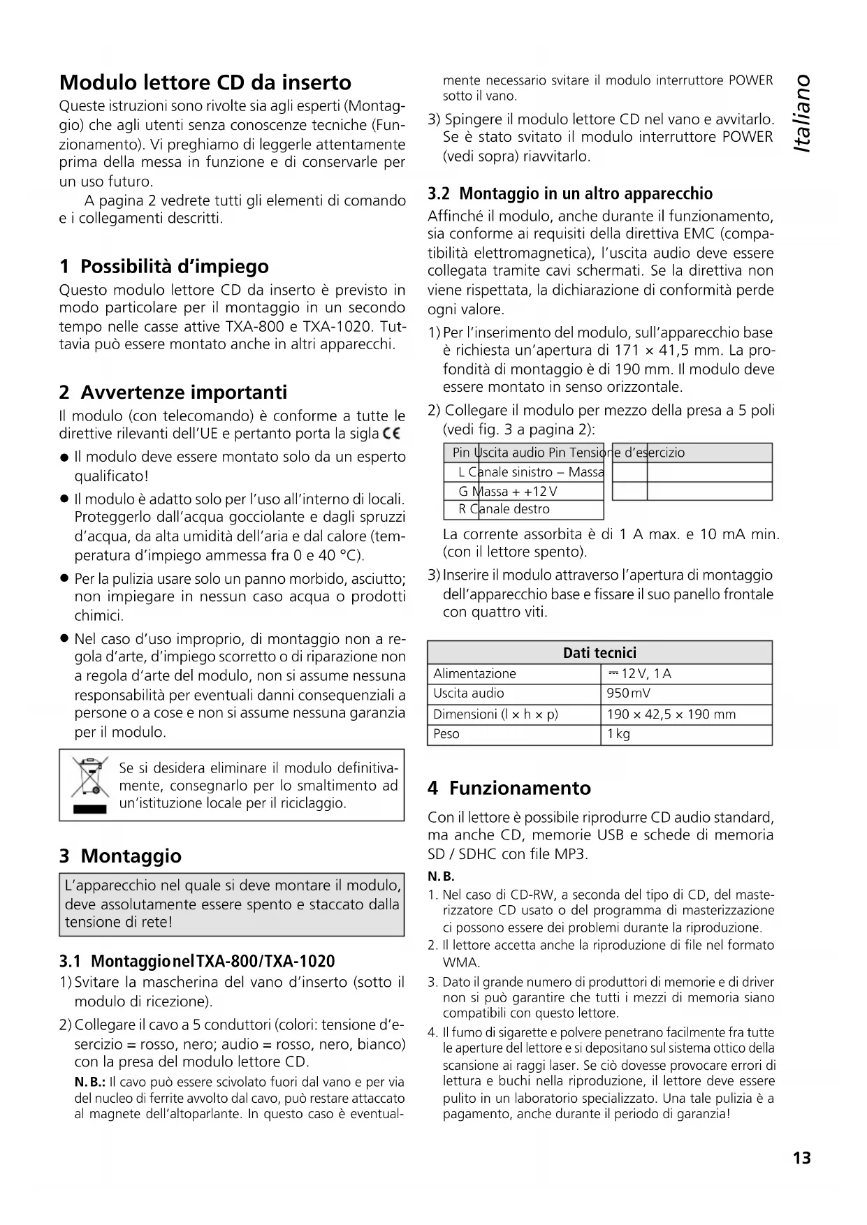 INTERNATIONAL GmbH & Co. KG. Toute reproduction même partielle à des fins commerciales est interdite.13 Italiano Modulo lettore CD da inserto Queste istruzioni sono rivolte sia agli esperti (Montag- gio) che agli utenti senza conoscenze tecniche (Fun- zionamento). Vi preghiamo di leggerle attentamente prima della messa in funzione e di conservarle per un uso futuro. A pagina 2 vedrete tutti gli elementi di comando e i collegamenti descritti. 1 Possibilità d’impiego Questo modulo lettore CD da inserto è previsto in modo particolare per il montaggio in un secondo tempo nelle casse attive TXA-800 e TXA-1020. Tut- tavia può essere montato anche in altri apparecchi. 2 Avvertenze importanti Il modulo (con telecomando) è conforme a tutte le direttive rilevanti dell’UE e pertanto porta la sigla .