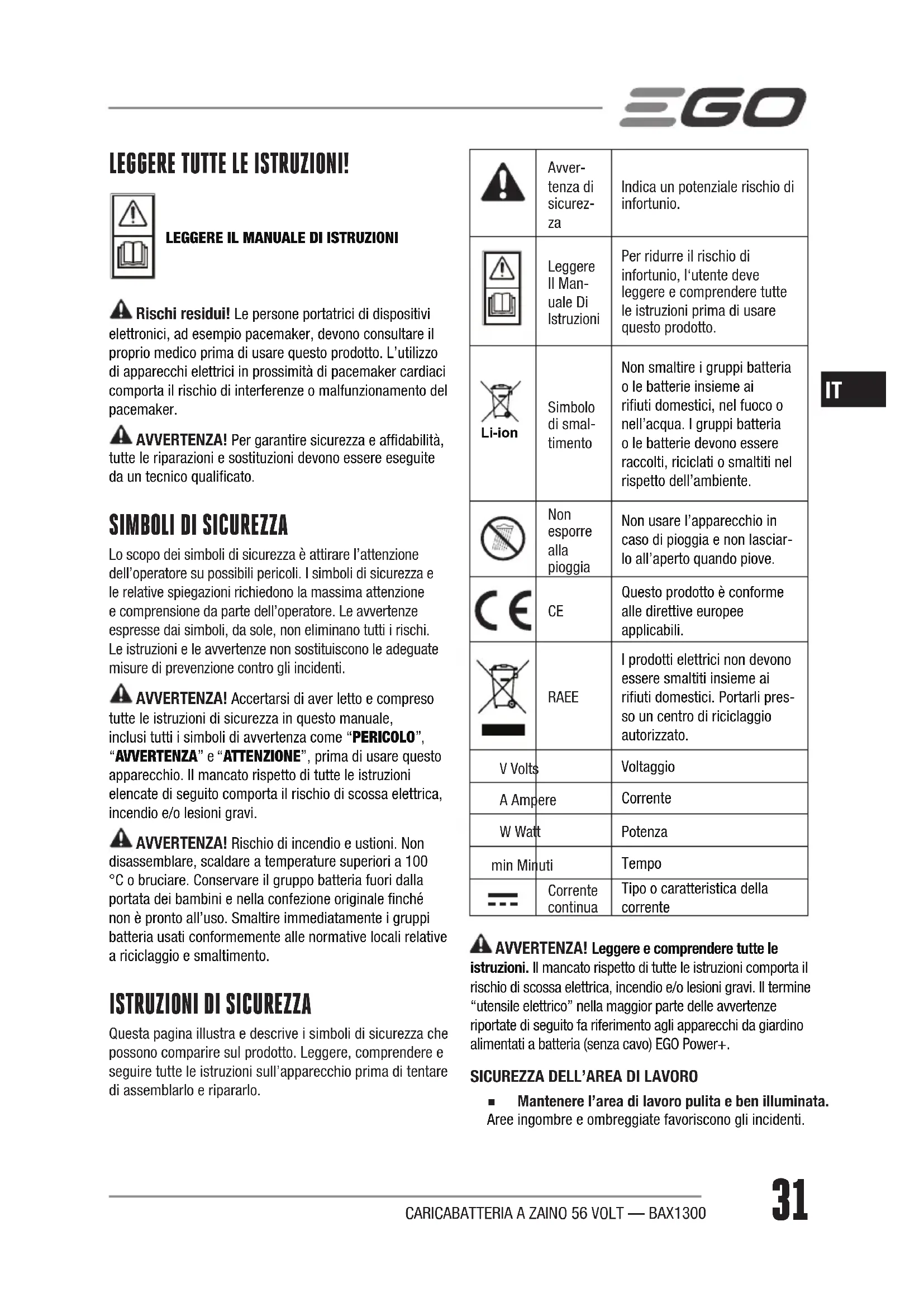 Questa pagina illustra e descrive i simboli di sicurezza che possono comparire sul prodotto. Leggere, comprendere e seguire tutte le istruzioni sull’apparecchio prima di tentare di assemblarlo e ripararlo.Avver-tenza di sicurez- Indica un potenziale rischio di infortunio.Leggere Il Man-uale Di IstruzioniPer ridurre il rischio di infortunio, l‘utente deve leggere e comprendere tutte le istruzioni prima di usare questo prodotto. Li-ion Simbolo di smal-timentoNon smaltire i gruppi batteria o le batterie insieme ai riuti domestici, nel fuoco o nell’acqua. I gruppi batteria o le batterie devono essere raccolti, riciclati o smaltiti nel rispetto dell’ambiente. Non esporre alla pioggiaNon usare l’apparecchio in caso di pioggia e non lasciar-lo all’aperto quando piove. Questo prodotto è conforme alle direttive europee applicabili. RAEE I prodotti elettrici non devono essere smaltiti insieme ai rifiuti domestici. Portarli pres-so un centro di riciclaggio autorizzato.V VoltsVoltaggioA AmpereCorrenteW WattPotenzamin MinutiTempoCorrente continuaTipo o caratteristica della corrente AVVERTENZA! Leggere e comprendere tutte le istruzioni. Il mancato rispetto di tutte le istruzioni comporta il rischio di scossa elettrica, incendio e/o lesioni gravi. Il termine “utensile elettrico” nella maggior parte delle avvertenze riportate di seguito fa riferimento agli apparecchi da giardino alimentati a batteria (senza cavo) EGO Power+.