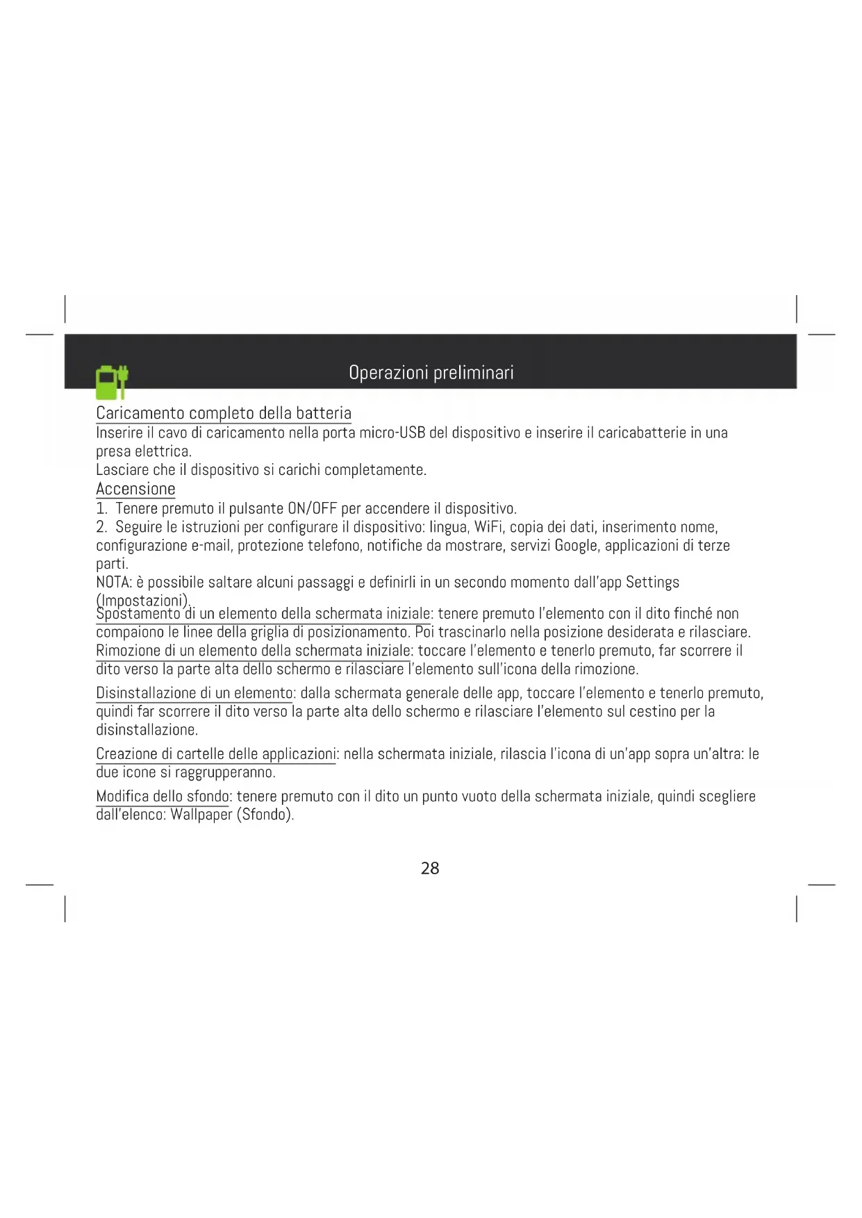 27 IT Descrizione del dispositivo Fotocamera anteriore Fotocamera posteriore Reset Jack per auricolari Porta micro-USB ON/OFF Volume +/- Altoparlante Microfono Altoparlante Coprire per lo slot per schede28 Operazioni preliminari Caricamento completo della batteria Inserire il cavo di caricamento nella porta micro-USB del dispositivo e inserire il caricabatterie in una presa elettrica. Lasciare che il dispositivo si carichi completamente. Accensione