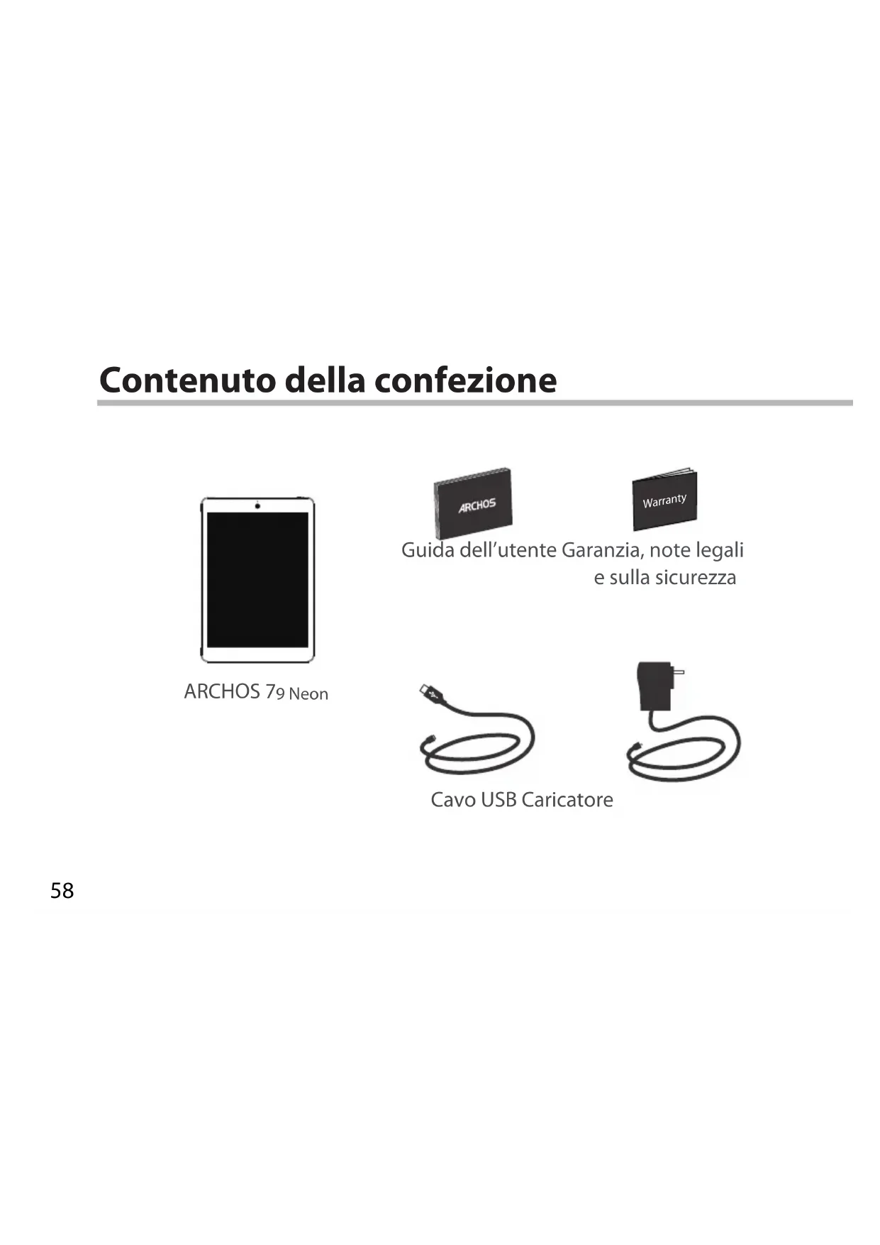 Warranty Warranty Contenuto della confezione Cavo USB Caricatore Guida dell’utente Garanzia, note legali e sulla sicurezza ARCHOS 7 9 Neon59