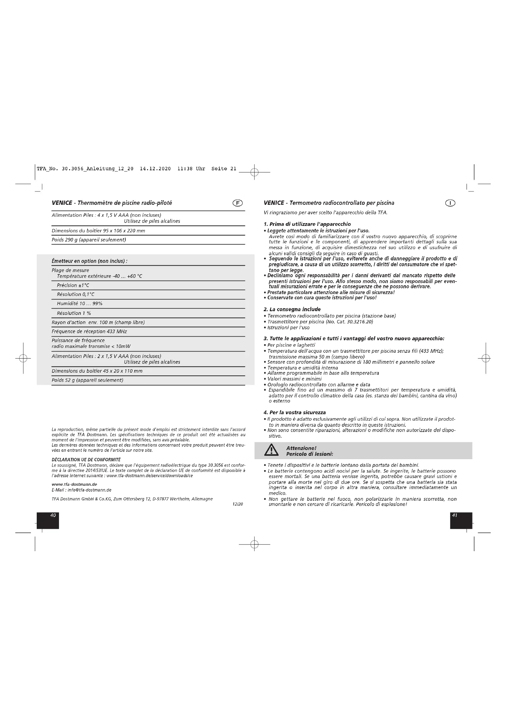 Questo prodotto è stato realizzato utilizzando materiali e componenti di alta qualità che possono essere riciclati e riutilizzati. È assolutamente vietato gettate le batterie tra i rifiuti domestici. In quali- tà di consumatori, siete tenuti per legge a consegnare le batterie usate al negoziante o ad altri enti preposti al riciclaggio in conformità alle vigenti disposizioni nazionali o locali, ai fini di uno smaltimento ecologico. Le sigle dei metalli pesanti contenuti sono: Cd=cadmio, Hg=mercurio, Pb=piombo TFA_No. 30.3056_Anleitung_12_20 14.12.2020 11:38 Uhr Seite 265352 VENICE - Termometro radiocontrollato per piscina