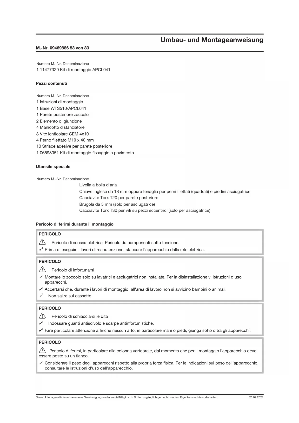 Base con cassetto per lavatrice ed asciugatrice WTS510/APCL041 Pezzi necessari Numero M.-Nr. Denominazione 1 09322300 Kit di montaggio WTS510Umbau- und Montageanweisung M.-Nr. 09469886 53 von 83 Diese Unterlagen dürfen ohne unsere Genehmigung weder vervielfältigt noch Dritten zugänglich gemacht werden. Eigentumsrechte vorbehalten. 26.02.2021 Numero M.-Nr. Denominazione 1 11477320 Kit di montaggio APCL041 Pezzi contenuti Numero M.-Nr. Denominazione 1 Istruzioni di montaggio 1 Base WTS510/APCL041 1 Parete posteriore zoccolo 2 Elemento di giunzione 4 Manicotto distanziatore 3 Vite lenticolare CEM 4x10 4 Perno filettato M10 x 40 mm 10 Strisce adesive per parete posteriore 1 06593051 Kit di montaggio fissaggio a pavimento Utensile speciale Numero M.-Nr. Denominazione Livella a bolla d'aria Chiave inglese da 18 mm oppure tenaglia per perni filettati (quadrati) e piedini asciugatrice Cacciavite Torx T20 per parete posteriore Brugola da 5 mm (solo per asciugatrice) Cacciavite Torx T30 per viti su pezzi eccentrici (solo per asciugatrice) Pericolo di ferirsi durante il montaggio PERICOLO Pericolo di scossa elettrica! Pericolo da componenti sotto tensione. A Prima di eseguire i lavori di manutenzione, staccare l'apparecchio dalla rete elettrica. PERICOLO Pericolo di infortunarsi A Montare lo zoccolo solo su lavatrici e asciugatrici non installate. Per la disinstallazione v. istruzioni d'uso apparecchi. A Accertarsi che, durante i lavori di montaggio, all'area di lavoro non si avvicino bambini o animali. A Non salire sul cassetto. PERICOLO Pericolo di schiacciarsi le dita A Indossare guanti antiscivolo e scarpe antinfortunistiche. A Fare particolare attenzione affinché nessun arto, in particolare mani o piedi, giunga sotto o tra gli apparecchi. PERICOLO Pericolo di ferirsi, in particolare alla colonna vertebrale, dal momento che per il montaggio l'apparecchio deve essere posto su un fianco. A Considerare il peso degli apparecchi rispetto alla propria forza fisica. Per le indicazioni sul peso dell'apparecchio, consultare le istruzioni d'uso dell'apparecchio.Umbau- und Montageanweisung M.-Nr. 09469886 54 von 83 Diese Unterlagen dürfen ohne unsere Genehmigung weder vervielfältigt noch Dritten zugänglich gemacht werden. Eigentumsrechte vorbehalten. 26.02.2021 Pericolo di ferirsi a causa di un montaggio errato AVVERTENZA Pericolo di infortunarsi per un apparecchio che si ribalta. A Utilizzare lo zoccolo solo per gli apparecchi Miele. A Non utilizzare lo zoccolo con gli apparecchi integrabili e le colonne bucato. A Avvitare la lavatrice allo zoccolo. A In caso di combinazioni di più zoccoli, collegare gli zoccoli con i connettori. A Nel posizionare un apparecchio singolo fissare lo zoccolo al pavimento con il kit di montaggio fissaggio a pavimento M.-Nr. 06593051. A Per il fissaggio a pavimento utilizzare perlomeno due piedini zoccolo, di cui almeno uno dietro. Un fissaggio a pavimento in diagonale è ottimale. Pericoli a causa di materiali non adatti riposti nel cassetto zoccolo PERICOLO A Non conservare sostanze infiammabili nel cassetto. AVVISO I pezzi in legno possono gonfiarsi o contrarsi. A Non conservare oggetti bagnati o umidi nel cassetto. Montare lo zoccolo Estrarre il cassetto dallo zoccolo A Estrarre il cassetto fino alla battuta d'arresto, v. imm. 2. A Premere le chiusure a scatto e contemporaneamente estrarre il cassetto verso l'alto, v. imm. 3. Montare lo zoccolo sotto l'asciugatrice A Vuotare il contenitore acqua di condensa. A Servendosi di una tenaglia, avvitare completamente i piedini dell'asciugatrice. A Con una brugola da 5 mm svitare i perni dallo zoccolo (A) ed eliminarli, v. imm. 4. A Avvitare il perno filettato da 10 x 40 mm in dotazione fino alla battuta d'arresto nel perno filettato grande (B),