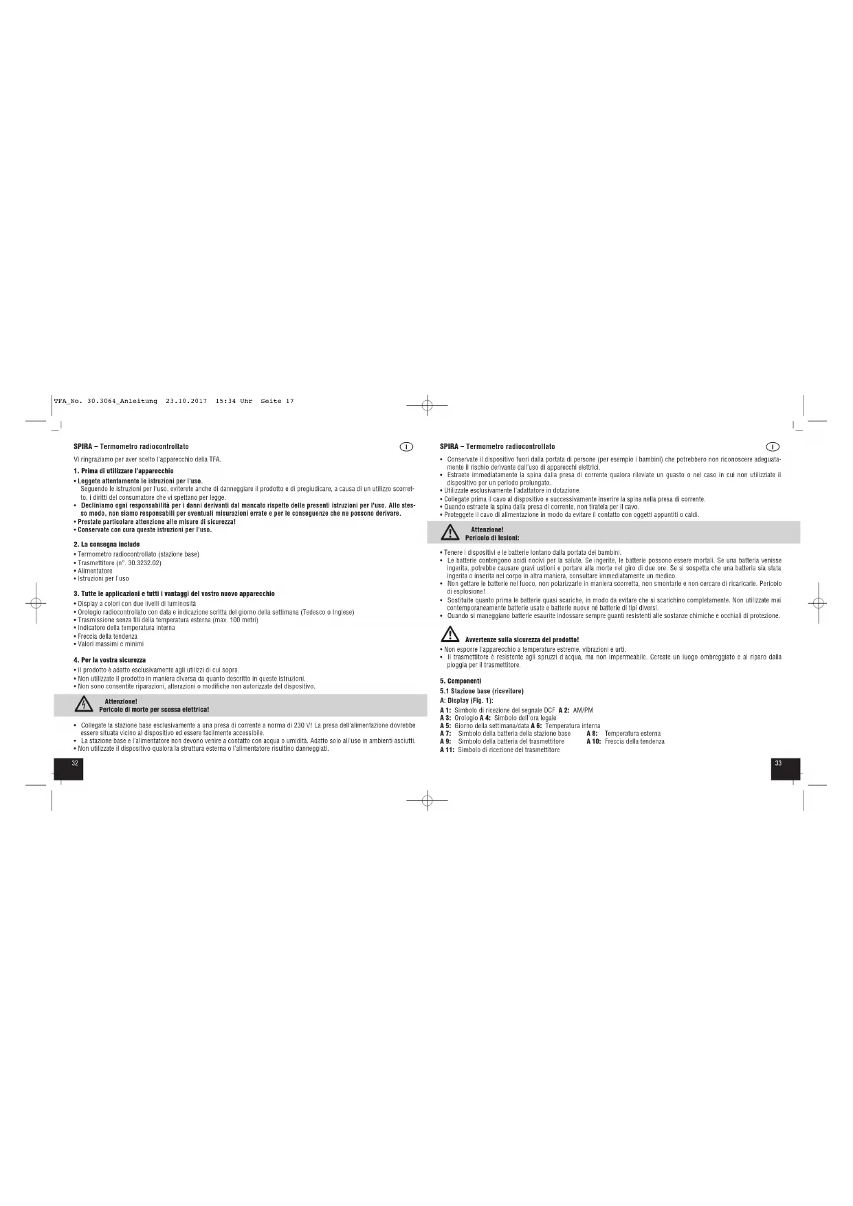A: Display (Fig. 1): A 1: Simbolo di ricezione del segnale DCF A 2: AM/PM A 3: Orologio A 4: Simbolo dell'ora legale A 5: Giorno della settimana/data A 6: Temperatura interna A 7: Simbolo della batteria della stazione base A 8: Temperatura esterna A 9: Simbolo della batteria del trasmettitore A 10: Freccia della tendenza A 11: Simbolo di ricezione del trasmettitore TFA_No. 30.3064_Anleitung 23.10.2017 15:34 Uhr Seite 173534 SPIRA – Termometro radiocontrollato