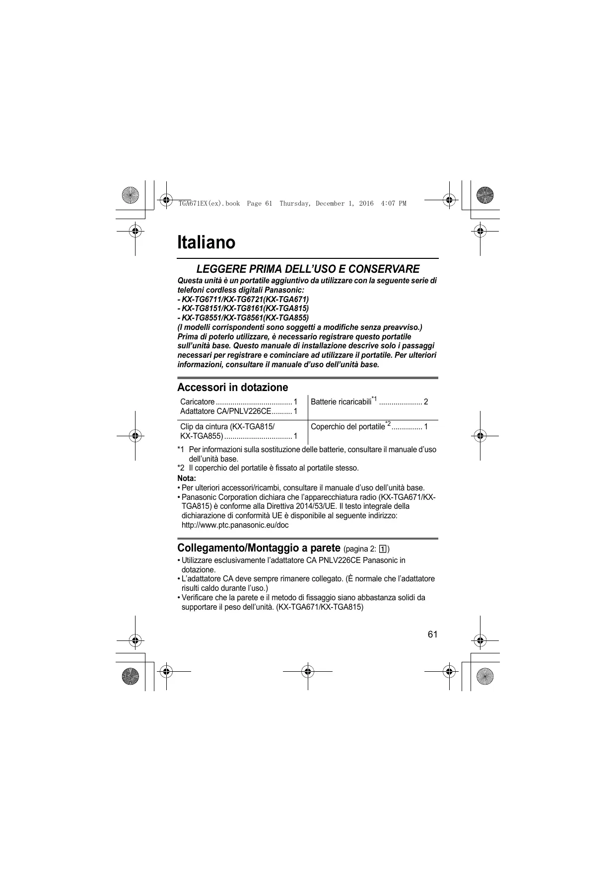 - Panasonic Corporation dichiara che l’apparecchiatura radio (KX-TGA671/KXTGA815) è conforme alla Direttiva 2014/53/UE. Il testo integrale della dichiarazione di conformità UE è disponibile al seguente indirizzo: http://www.ptc.panasonic.eu/doc Collegamento/Montaggio a parete (pagina 2: 1)