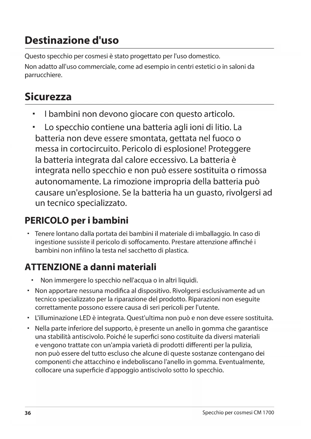 Specchio per cosmesi CM 1700 Destinazione d'uso Questo specchio per cosmesi è stato progettato per l'uso domestico. Non adatto all'uso commerciale, come ad esempio in centri estetici o in saloni da parrucchiere. Sicurezza I bambini non devono giocare con questo articolo. Lo specchio contiene una batteria agli ioni di litio. La batteria non deve essere smontata, gettata nel fuoco o messa in cortocircuito. Pericolo di esplosione! Proteggere la batteria integrata dal calore eccessivo. La batteria è integrata nello specchio e non può essere sostituita o rimossa autonomamente. La rimozione impropria della batteria può causare un'esplosione. Se la batteria ha un guasto, rivolgersi ad un tecnico specializzato. PERICOLO per i bambini Tenere lontano dalla portata dei bambini il materiale di imballaggio. In caso di ingestione sussiste il pericolo di soocamento. Prestare attenzione anché i bambini non inlino la testa nel sacchetto di plastica. ATTENZIONE a danni materiali Non immergere lo specchio nell'acqua o in altri liquidi. Non apportare nessuna modica al dispositivo. Rivolgersi esclusivamente ad un tecnico specializzato per la riparazione del prodotto. Riparazioni non eseguite correttamente possono essere causa di seri pericoli per l'utente. L'illuminazione LED è integrata. Quest'ultima non può e non deve essere sostituita. Nella parte inferiore del supporto, è presente un anello in gomma che garantisce una stabilità antiscivolo. Poiché le superci sono costituite da diversi materiali e vengono trattate con un'ampia varietà di prodotti dierenti per la pulizia, non può essere del tutto escluso che alcune di queste sostanze contengano dei componenti che attacchino e indeboliscano l'anello in gomma. Eventualmente, collocare una supercie d'appoggio antiscivolo sotto lo specchio. Druckbuch Kosmetikspiegel CM 1700.indb 36 13.11.2017 13:54:24Descrizione (Ambito della fornitura)