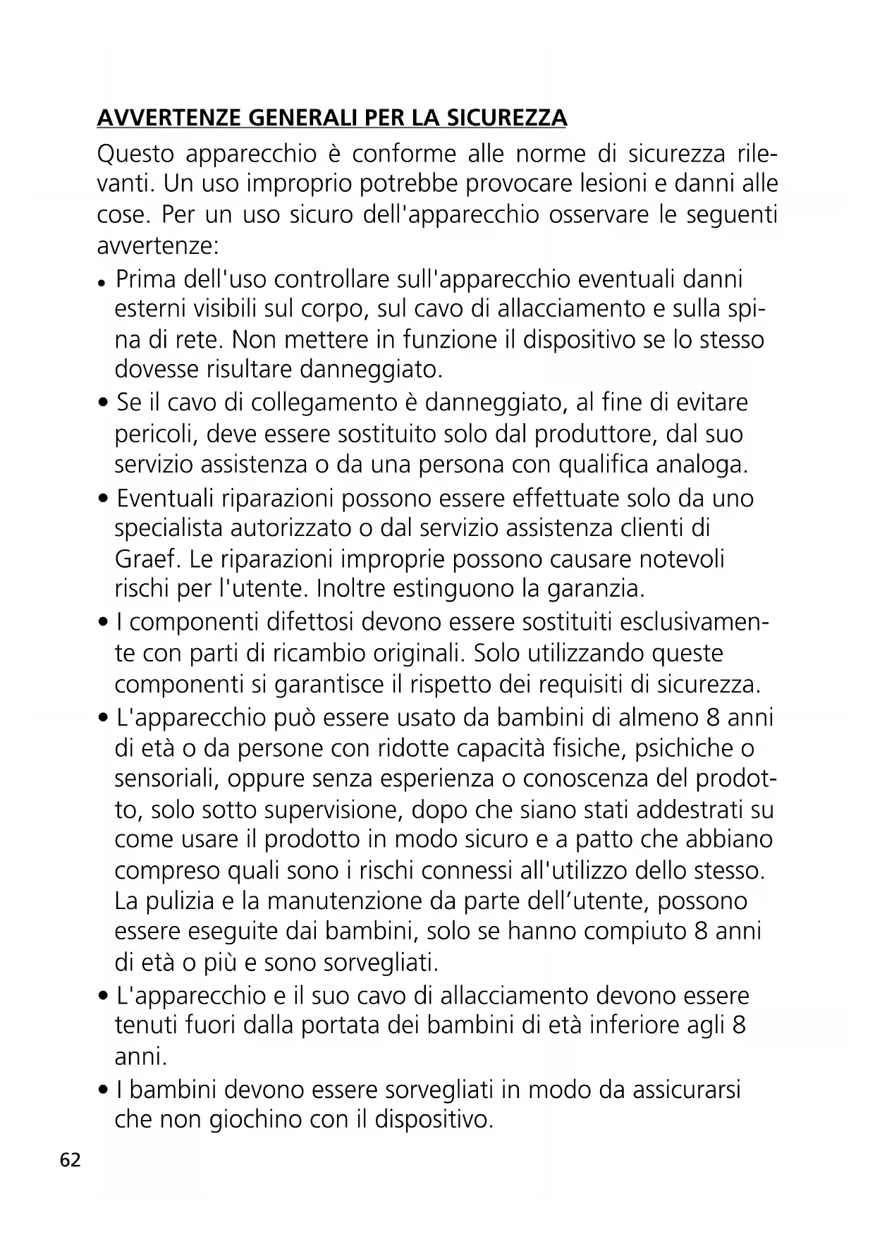 - Eventuali riparazioni possono essere effettuate solo da uno specialista autorizzato o dal servizio assistenza clienti di Graef. Le riparazioni improprie possono causare notevoli rischi per l'utente. Inoltre estinguono la garanzia.