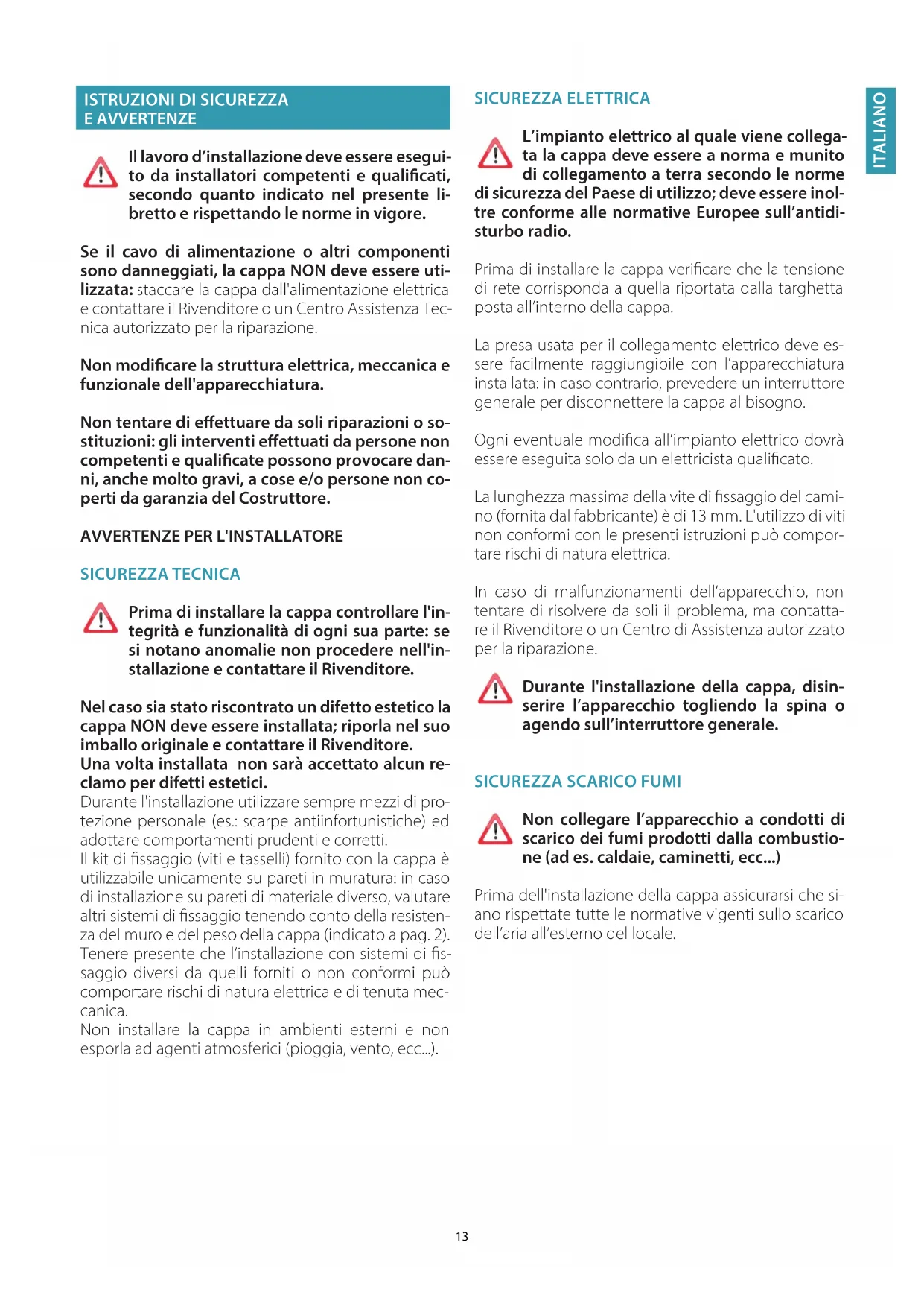 SICUREZZA TECNICA Prima di installare la cappa controllare l'in- tegrità e funzionalità di ogni sua parte: se si notano anomalie non procedere nell'in- stallazione e contattare il Rivenditore. Nel caso sia stato riscontrato un difetto estetico la cappa NON deve essere installata; riporla nel suo imballo originale e contattare il Rivenditore. Una volta installata non sarà accettato alcun re- clamo per difetti estetici. Durante l'installazione utilizzare sempre mezzi di pro- tezione personale (es.: scarpe antiinfortunistiche) ed adottare comportamenti prudenti e corretti. Il kit di ssaggio (viti e tasselli) fornito con la cappa è utilizzabile unicamente su pareti in muratura: in caso di installazione su pareti di materiale diverso, valutare altri sistemi di ssaggio tenendo conto della resisten- za del muro e del peso della cappa (indicato a pag. 2). Tenere presente che l’installazione con sistemi di s- saggio diversi da quelli forniti o non conformi può comportare rischi di natura elettrica e di tenuta mec- canica. Non installare la cappa in ambienti esterni e non esporla ad agenti atmosferici (pioggia, vento, ecc...). SICUREZZA ELETTRICA L’impianto elettrico al quale viene collega- ta la cappa deve essere a norma e munito di collegamento a terra secondo le norme di sicurezza del Paese di utilizzo; deve essere inol- tre conforme alle normative Europee sull’antidi- sturbo radio. Prima di installare la cappa vericare che la tensione di rete corrisponda a quella riportata dalla targhetta posta all’interno della cappa. La presa usata per il collegamento elettrico deve es- sere facilmente raggiungibile con l’apparecchiatura installata: in caso contrario, prevedere un interruttore generale per disconnettere la cappa al bisogno. Ogni eventuale modica all’impianto elettrico dovrà essere eseguita solo da un elettricista qualicato. La lunghezza massima della vite di ssaggio del cami- no (fornita dal fabbricante) è di 13 mm. L'utilizzo di viti non conformi con le presenti istruzioni può compor- tare rischi di natura elettrica. In caso di malfunzionamenti dell’apparecchio, non tentare di risolvere da soli il problema, ma contatta- re il Rivenditore o un Centro di Assistenza autorizzato per la riparazione. Durante l'installazione della cappa, disin- serire l’apparecchio togliendo la spina o agendo sull’interruttore generale.
