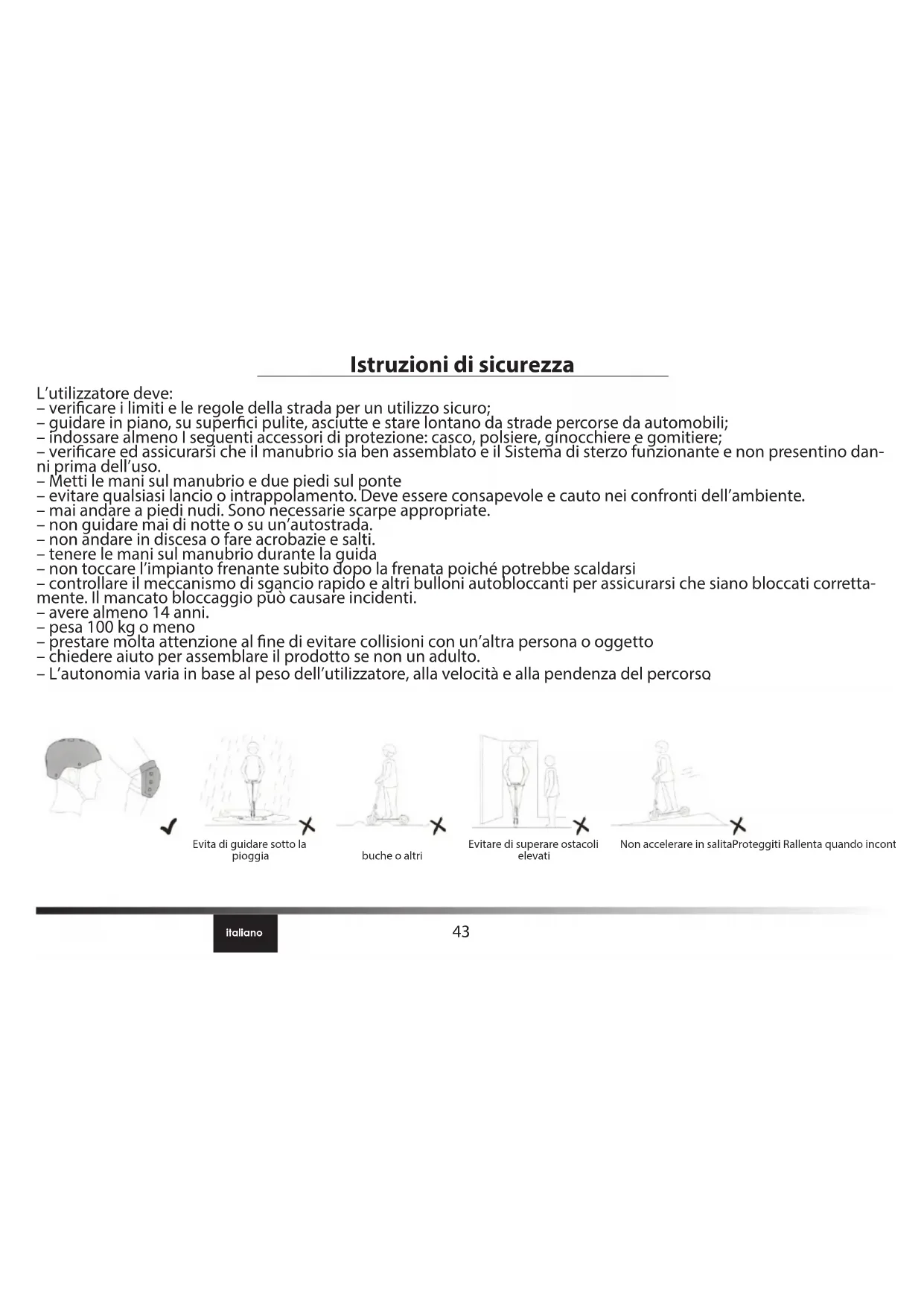 Evitare di superare ostacoli elevati Non accelerare in salitaProteggiti Rallenta quando incontri buche o altri Evita di guidare sotto la pioggia44