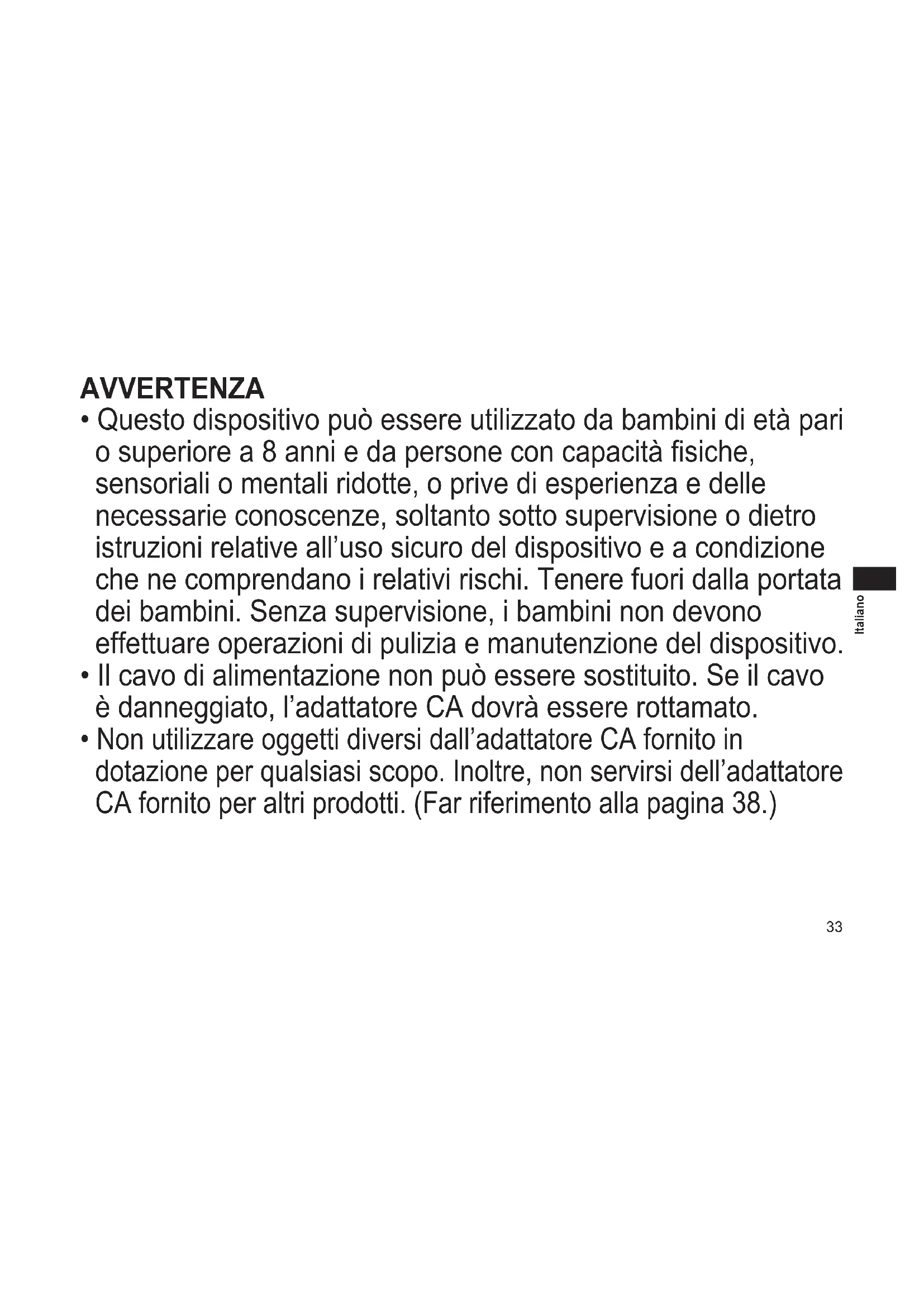 - Questo dispositivo può essere utilizzato da bambini di età pari o superiore a 8 anni e da persone con capacità siche, sensoriali o mentali ridotte, o prive di esperienza e delle necessarie conoscenze, soltanto sotto supervisione o dietro istruzioni relative all’uso sicuro del dispositivo e a condizione che ne comprendano i relativi rischi. Tenere fuori dalla portata dei bambini. Senza supervisione, i bambini non devono effettuare operazioni di pulizia e manutenzione del dispositivo.