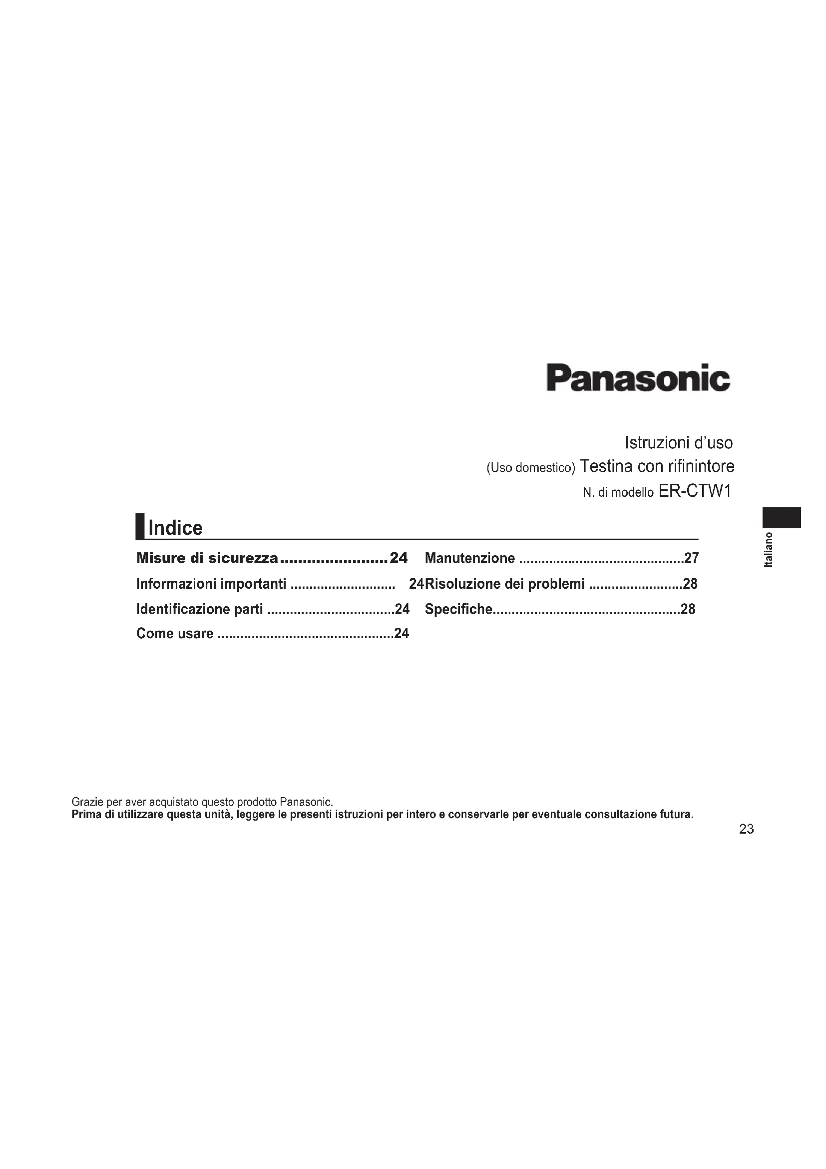 Scarica le istruzioni per il tuo Rifinitore per barba in formato PDF gratuitamente! Trova il tuo manuale ERCTW1 - PANASONIC e riprendi in mano il tuo dispositivo elettronico. In questa pagina sono pubblicati tutti i documenti necessari per l'utilizzo del tuo dispositivo. ERCTW1 del marchio PANASONIC.