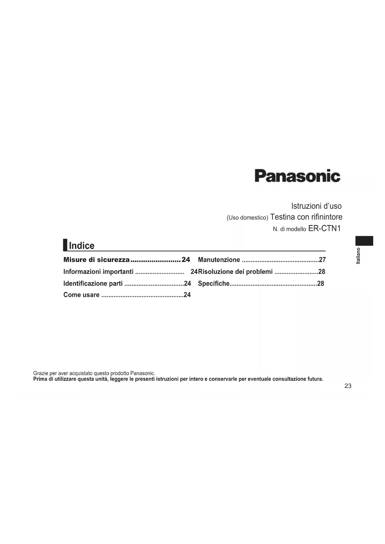 Scarica le istruzioni per il tuo Tosaerba elettrico in formato PDF gratuitamente! Trova il tuo manuale ERCTN1 - PANASONIC e riprendi in mano il tuo dispositivo elettronico. In questa pagina sono pubblicati tutti i documenti necessari per l'utilizzo del tuo dispositivo. ERCTN1 del marchio PANASONIC.