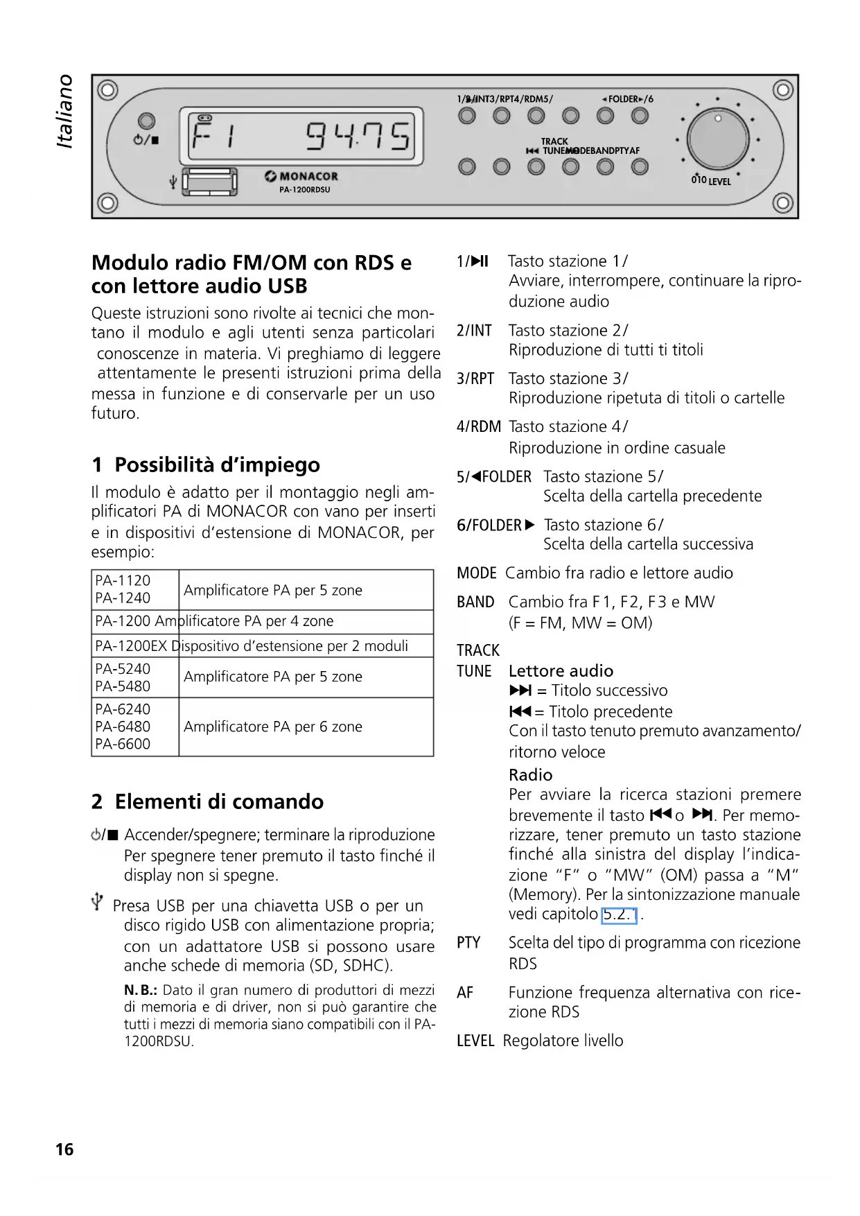 PA1200RDSU - Radio lecteur audio USB Monacor - Manuale utente e istruzioni gratuiti