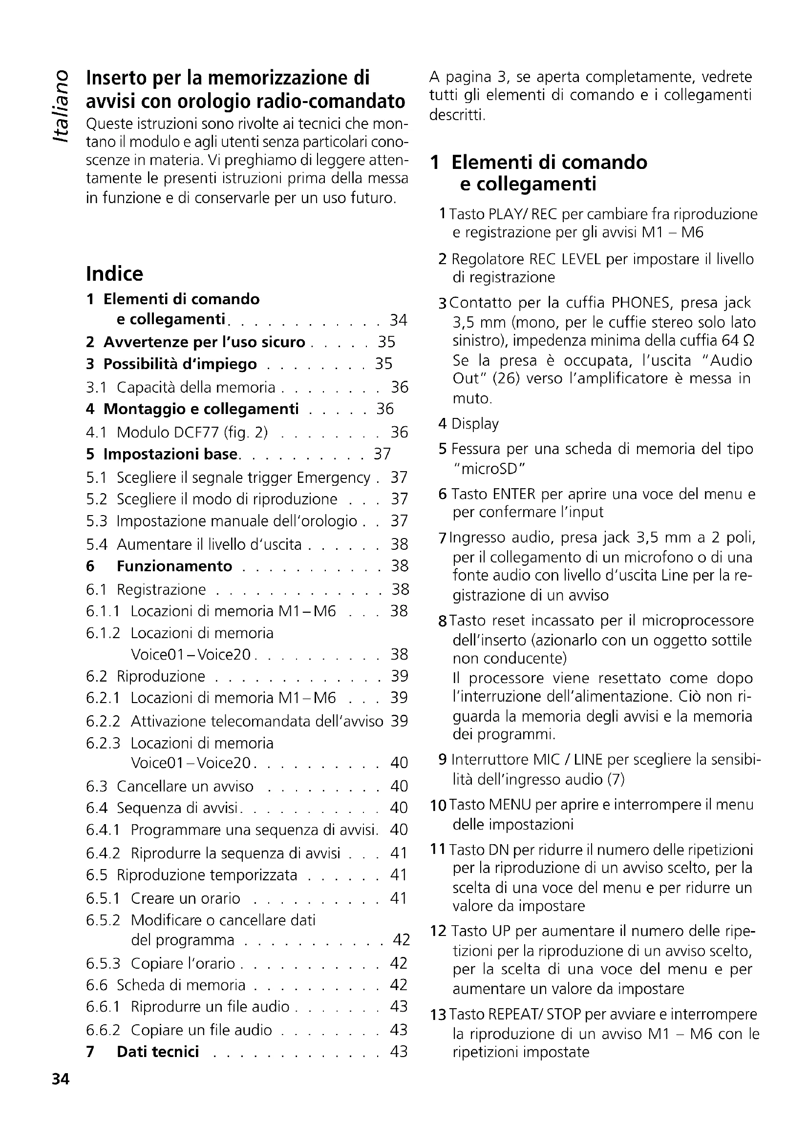 7 Dati tecnici . . . . . . . . . . . . . 43 Italiano Italiano Pagina Indice35 Italiano 14 Tasto START/ STOP per avviare e interrompere la riproduzione per una sola volta di un avviso M1 – M6 15 Tasti M1 – M6 per scegliere una locazione di memoria per la registrazione o riproduzione di un avviso 16 Regolatore LEVEL per impostare il volume di riproduzione