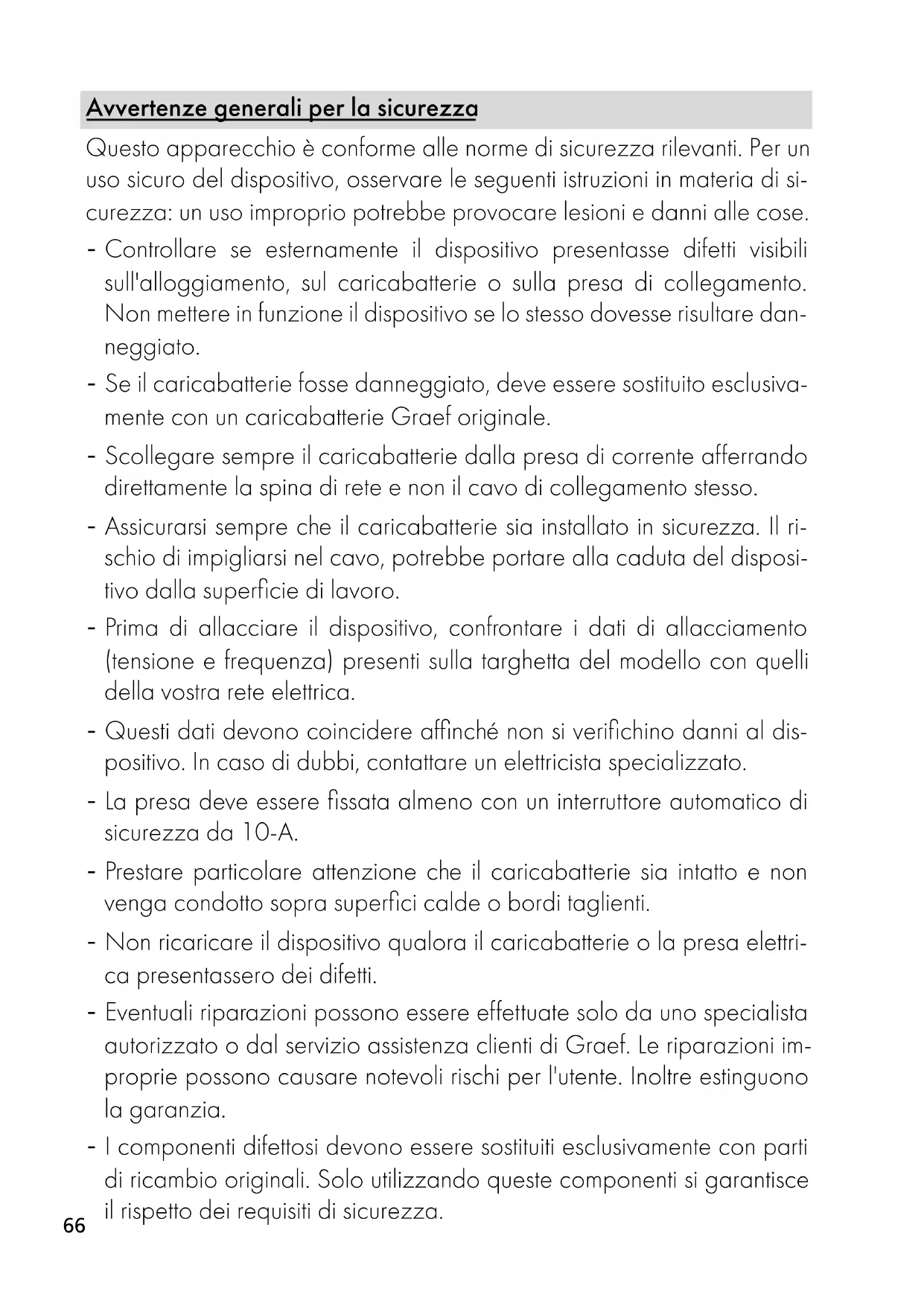 - Garanzia Avvertenze generali per la sicurezza Questo apparecchio è conforme alle norme di sicurezza rilevanti. Per un uso sicuro del dispositivo, osservare le seguenti istruzioni in materia di si- curezza: un uso improprio potrebbe provocare lesioni e danni alle cose. - Controllare se esternamente il dispositivo presentasse difetti visibili sull'alloggiamento, sul caricabatterie o sulla presa di collegamento. Non mettere in funzione il dispositivo se lo stesso dovesse risultare dan- neggiato. - Se il caricabatterie fosse danneggiato, deve essere sostituito esclusiva- mente con un caricabatterie Graef originale. - Scollegare sempre il caricabatterie dalla presa di corrente afferrando direttamente la spina di rete e non il cavo di collegamento stesso. - Assicurarsi sempre che il caricabatterie sia installato in sicurezza. Il ri- schio di impigliarsi nel cavo, potrebbe portare alla caduta del disposi- tivo dalla superficie di lavoro. - Prima di allacciare il dispositivo, confrontare i dati di allacciamento (tensione e frequenza) presenti sulla targhetta del modello con quelli della vostra rete elettrica. - Questi dati devono coincidere affinché non si verifichino danni al dis- positivo. In caso di dubbi, contattare un elettricista specializzato. - La presa deve essere fissata almeno con un interruttore automatico di sicurezza da 10-A. - Prestare particolare attenzione che il caricabatterie sia intatto e non venga condotto sopra superfici calde o bordi taglienti. - Non ricaricare il dispositivo qualora il caricabatterie o la presa elettri- ca presentassero dei difetti. - Eventuali riparazioni possono essere effettuate solo da uno specialista autorizzato o dal servizio assistenza clienti di Graef. Le riparazioni im- proprie possono causare notevoli rischi per l'utente. Inoltre estinguono la garanzia. - I componenti difettosi devono essere sostituiti esclusivamente con parti di ricambio originali. Solo utilizzando queste componenti si garantisce il rispetto dei requisiti di sicurezza.67 p. 7666