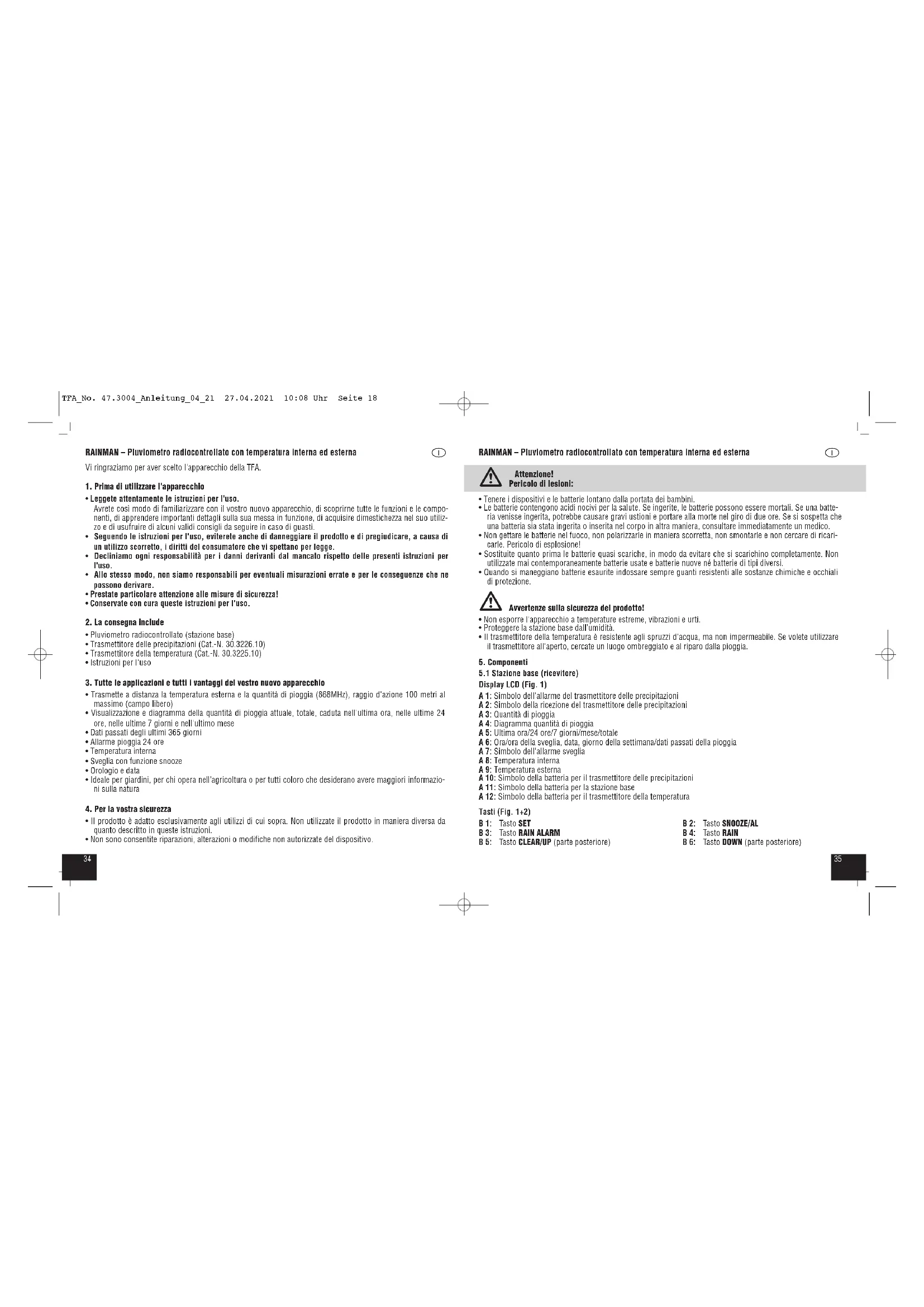 - Non sono consentite riparazioni, alterazioni o modifiche non autorizzate del dispositivo. TFA_No. 47.3004_Anleitung_04_21 27.04.2021 10:08 Uhr Seite 183736 RAINMAN – Pluviometro radiocontrollato con temperatura interna ed esterna