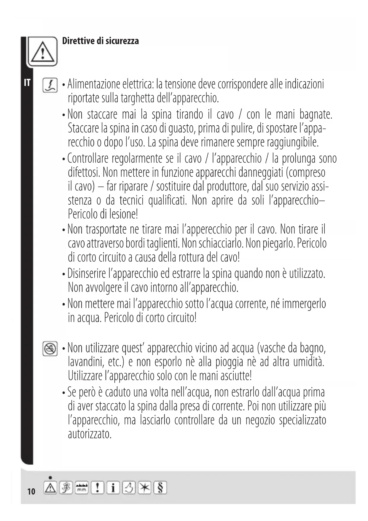 - Non utilizzare quest’ apparecchio vicino ad acqua (vasche da bagno, lavandini, etc.) e non esporlo nè alla pioggia nè ad altra umidità. Utilizzare l’apparecchio solo con le mani asciutte!11 Direttive di sicurezza