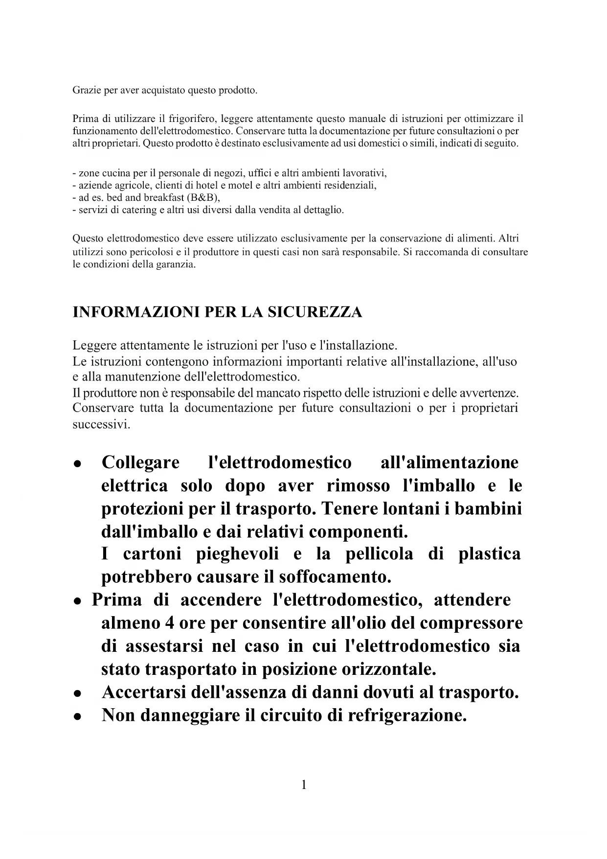 Grazie per aver acquistato questo prodotto. Prima di utilizzare il frigorifero, leggere attentamente questo manuale di istruzioni per ottimizzare il funzionamento dell'elettrodomestico. Conservare tutta la documentazione per future consultazioni o per altri proprietari. Questo prodotto è destinato esclusivamente ad usi domestici o simili, indicati di seguito. - zone cucina per il personale di negozi, uffici e altri ambienti lavorativi, - aziende agricole, clienti di hotel e motel e altri ambienti residenziali, - ad es. bed and breakfast (B&B), - servizi di catering e altri usi diversi dalla vendita al dettaglio. Questo elettrodomestico deve essere utilizzato esclusivamente per la conservazione di alimenti. Altri utilizzi sono pericolosi e il produttore in questi casi non sarà responsabile. Si raccomanda di consultare le condizioni della garanzia.