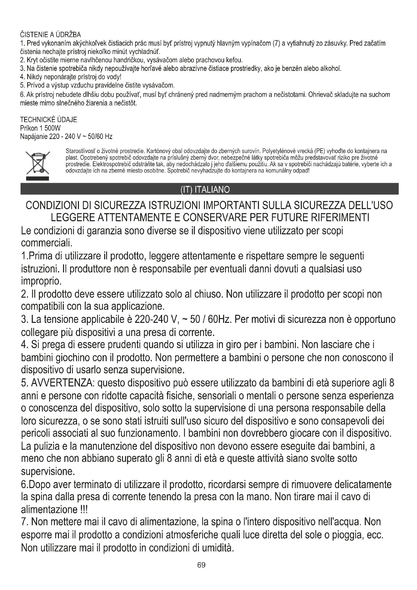 4.Non immergere mai l'apparecchio in acqua! 5.Pulire regolarmente l'ingresso e l'uscita dell'aria con un aspirapolvere. 6.Se l'apparecchio non viene utilizzato per un lungo periodo, deve essere protetto da polvere e sporco eccessivi. Conservare la stufa in un luogo asciutto, lontano dalla luce solare e dallo sporco. DATI TECNICI Potenza 1500 W. Alimentazione 220-240V ~ 50 / 60Hz Prendersi cura dell'ambiente Gli imballi di cartone devono essere smaltiti nel contenitore per la carta. I sacchetti di polietilene (PE) vanno gettati nel contenitore per la plastica. L'apparecchio usato deve essere rottamato presso un centro di raccolta autorizzato, poiché contiene elementi pericolosi che potrebbero costituire una minaccia per l'ambiente. I dispositivi elettrici devono essere resi al fine di evitare il loro riutilizzo. Se il dispositivo contiene una batteria, deve essere rimossa e smaltita separatamente in un punto di raccolta. Non gettare l'apparecchio nei contenitori dei rifiuti urbani! (SR) СРПСКИ УВЈЕТИ ЗА СИГУРНОСТ ВАЖНЕ УПУТЕ О СИГУРНОСТИ УПОТРЕБЕ МОЛИМО ВАС ДА ПРОЧИТАЈТЕ И ПОГЛЕДАЈТЕ ЗА БУДУЋЕ РЕФЕРЕНЦЕ Услови гаранције су различити, ако се уређај користи у комерцијалне сврхе. "