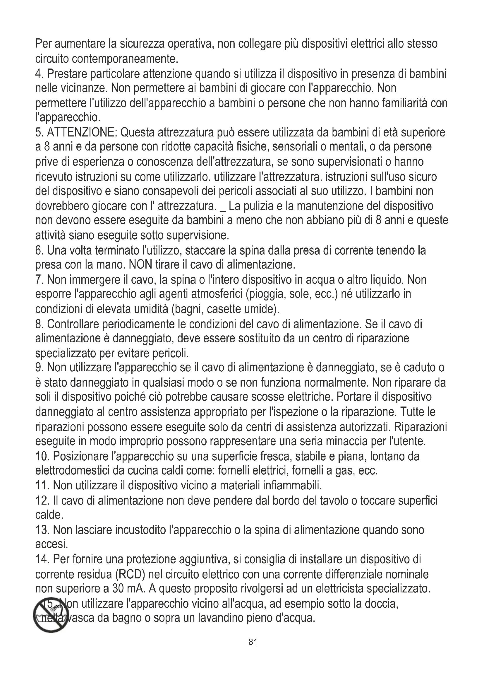 15. Non utilizzare l'apparecchio vicino all'acqua, ad esempio sotto la doccia,