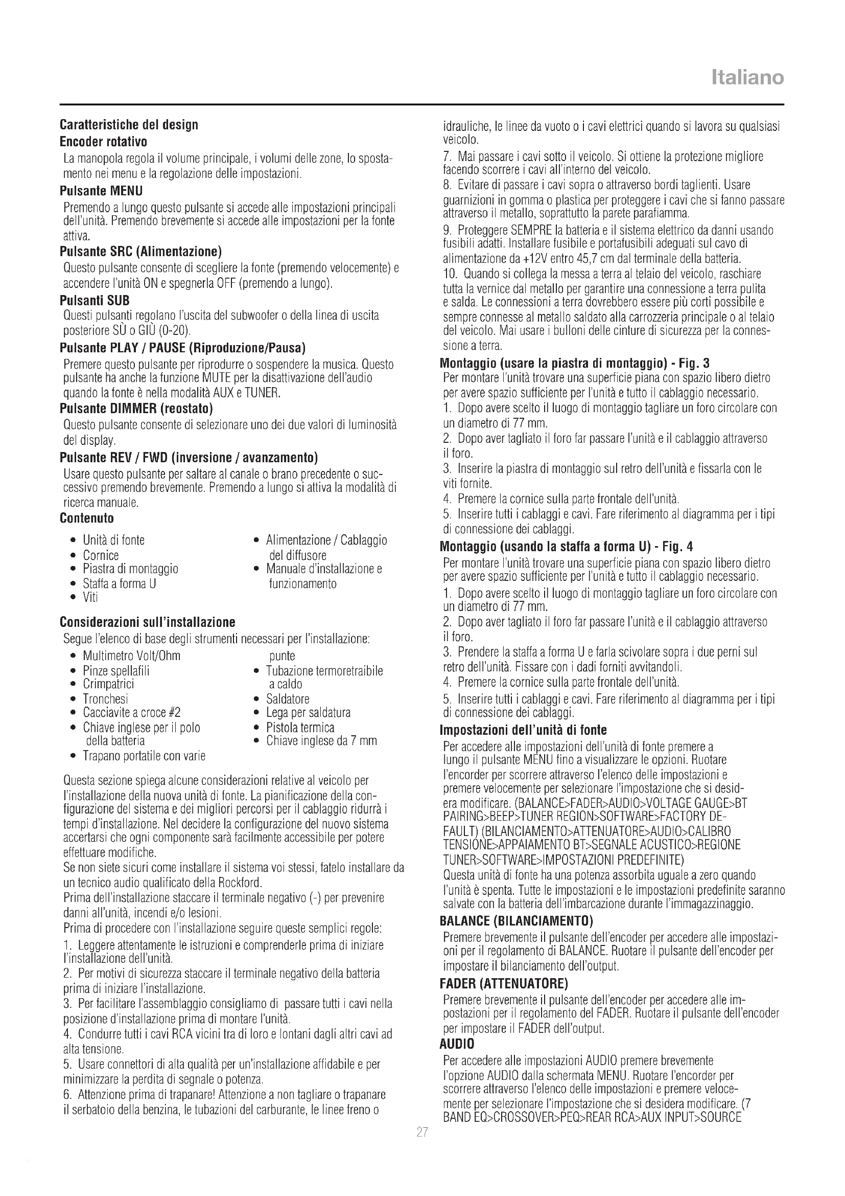 di connessione dei cablaggi. Impostazioni dell’unità di fonte Per accedere alle impostazioni dell’unità di fonte premere a lungo il pulsante MENU fino a visualizzare le opzioni. Ruotare l’encorder per scorrere attraverso l’elenco delle impostazioni e premere velocemente per selezionare l’impostazione che si desid- era modificare. (BALANCE>FADER>AUDIO>VOLTAGE GAUGE>BT PAIRING>BEEP>TUNER REGION>SOFTWARE>FACTORY DE-