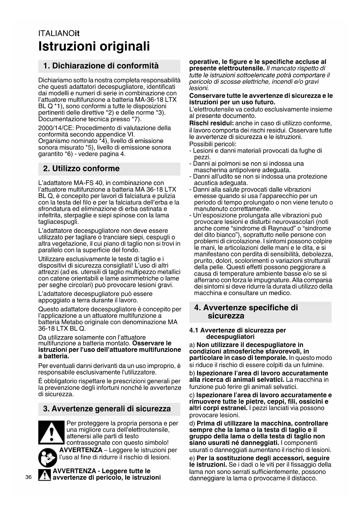 Istruzioni originali Dichiariamo sotto la nostra completa responsabilità che questi adattatori decespugliatore, identificati dai modelli e numeri di serie in combinazione con l’attuatore multifunzione a batteria MA-36-18 LTX BL Q *1), sono conformi a tutte le disposizioni pertinenti delle direttive *2) e delle norme *3). Documentazione tecnica presso *7). 2000/14/CE: Procedimento di valutazione della conformità secondo appendice VI. Organismo nominato *4), livello di emissione sonora misurato *5), livello di emissione sonora garantito *6) - vedere pagina 4. L’adattatore MA-FS 40, in combinazione con l’attuatore multifunzione a batteria MA 36-18 LTX BL Q, è concepito per lavori di falciatura e pulizia con la testa del filo e per la falciatura dell’erba e la sfrondatura ed eliminazione di erba ostinata e infeltrita, sterpaglie e siepi spinose con la lama tagliacespugli. L’adattatore decespugliatore non deve essere utilizzato per tagliare o tranciare siepi, cespugli o altra vegetazione, il cui piano di taglio non si trovi in parallelo con la superficie del fondo. Utilizzare esclusivamente le teste di taglio e i dispositivi di sicurezza consigliati! L’uso di altri attrezzi (ad es. utensili di taglio multipezzo metallici con catene orientabili e lame asimmetriche o lame per seghe circolari) può provocare lesioni gravi. L’adattatore decespugliatore può essere appoggiato a terra durante il lavoro. Questo adattatore decespugliatore è concepito per l’applicazione a un attuatore multifunzione a batteria Metabo originale con denominazione MA 36-18 LTX BL Q. Da utilizzare solamente con l’attuatore multifunzione a batteria montato. Osservare le istruzioni per l'uso dell’attuatore multifunzione a batteria. Per eventuali danni derivanti da un uso improprio, è responsabile esclusivamente l'utilizzatore. È obbligatorio rispettare le prescrizioni generali per la prevenzione degli infortuni nonché le avvertenze di sicurezza. Per proteggere la propria persona e per una migliore cura dell'elettroutensile, attenersi alle parti di testo contrassegnate con questo simbolo! AVVERTENZA – Leggere le istruzioni per l’uso al fine di ridurre il rischio di lesioni. AVVERTENZA - Leggere tutte le avvertenze di pericolo, le istruzioni operative, le figure e le specifiche accluse al presente elettroutensile. Il mancato rispetto di tutte le istruzioni sottoelencate potrà comportare il pericolo di scosse elettriche, incendi e/o gravi lesioni. Conservare tutte le avvertenze di sicurezza e le istruzioni per un uso futuro. L'elettroutensile va ceduto esclusivamente insieme al presente documento. Rischi residui: anche in caso di utilizzo conforme, il lavoro comporta dei rischi residui. Osservare tutte le avvertenze di sicurezza e le istruzioni. Possibili pericoli: - Lesioni e danni materiali provocati da fughe di pezzi. - Danni ai polmoni se non si indossa una mascherina antipolvere adeguata. - Danni all'udito se non si indossa una protezione acustica adeguata. - Danni alla salute provocati dalle vibrazioni emesse quando si usa l’apparecchio per un periodo di tempo prolungato o non viene tenuto o manutenuto correttamente. - Un’esposizione prolungata alle vibrazioni può provocare lesioni e disturbi neurovascolari (noti anche come “sindrome di Raynaud” o “sindrome del dito bianco”), soprattutto nelle persone con problemi di circolazione. I sintomi possono colpire le mani, le articolazioni delle mani e le dita, e si manifestano con perdita di sensibilità, debolezza, prurito, dolori, scolorimenti o variazioni strutturali della pelle. Questi effetti possono peggiorare a causa di temperature ambiente basse e/o se si afferrano con forza le impugnature. Alla comparsa dei sintomi si deve ridurre la durata di utilizzo della macchina e consultare un medico.