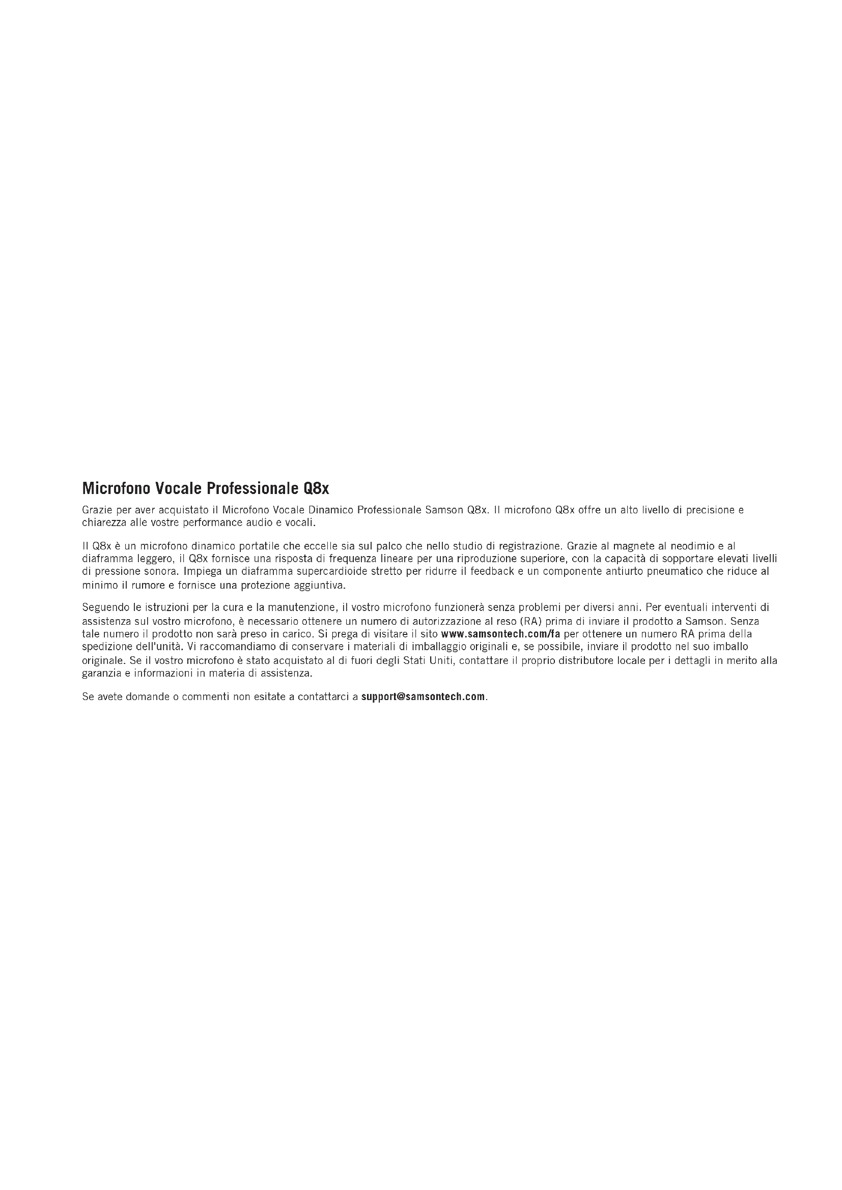 - ,09” x 2,125” (180 mm x 54 mm) Peso ,97 lb (0,44kg) EspecificacionesGrazie per aver acquistato il Microfono Vocale Dinamico Professionale Samson Q8x. Il microfono Q8x offre un alto livello di precisione e chiarezza alle vostre performance audio e vocali. Il Q8x è un microfono dinamico portatile che eccelle sia sul palco che nello studio di registrazione. Grazie al magnete al neodimio e al diaframma leggero, il Q8x fornisce una risposta di frequenza lineare per una riproduzione superiore, con la capacità di sopportare elevati livelli di pressione sonora. Impiega un diaframma supercardioide stretto per ridurre il feedback e un componente antiurto pneumatico che riduce al minimo il rumore e fornisce una protezione aggiuntiva. Seguendo le istruzioni per la cura e la manutenzione, il vostro microfono funzionerà senza problemi per diversi anni. Per eventuali interventi di assistenza sul vostro microfono, è necessario ottenere un numero di autorizzazione al reso (RA) prima di inviare il prodotto a Samson. Senza tale numero il prodotto non sarà preso in carico. Si prega di visitare il sito www.samsontech.com/fa per ottenere un numero RA prima della spedizione dell'unità. Vi raccomandiamo di conservare i materiali di imballaggio originali e, se possibile, inviare il prodotto nel suo imballo originale. Se il vostro microfono è stato acquistato al di fuori degli Stati Uniti, contattare il proprio distributore locale per i dettagli in merito alla garanzia e informazioni in materia di assistenza. Se avete domande o commenti non esitate a contattarci a support@samsontech.com. Microfono Vocale Professionale Q8xEN FR DE ES IT p. 0