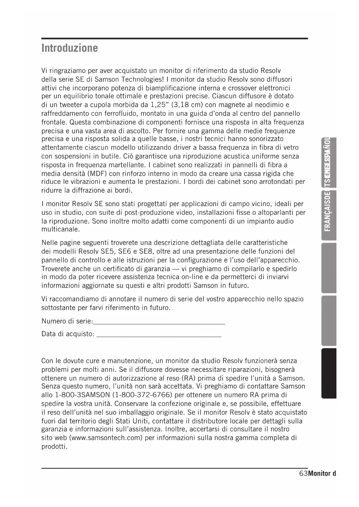 63Monitor da studio Resolv SE Vi ringraziamo per aver acquistato un monitor di riferimento da studio Resolv della serie SE di Samson Technologies! I monitor da studio Resolv sono diffusori attivi che incorporano potenza di biamplificazione interna e crossover elettronici per un equilibrio tonale ottimale e prestazioni precise. Ciascun diffusore è dotato di un tweeter a cupola morbida da 1,25” (3,18 cm) con magnete al neodimio e raffreddamento con ferrofluido, montato in una guida d’onda al centro del pannello frontale. Questa combinazione di componenti fornisce una risposta in alta frequenza precisa e una vasta area di ascolto. Per fornire una gamma delle medie frequenze precisa e una risposta solida a quelle basse, i nostri tecnici hanno sonorizzato attentamente ciascun modello utilizzando driver a bassa frequenza in fibra di vetro con sospensioni in butile. Ciò garantisce una riproduzione acustica uniforme senza risposta in frequenza martellante. I cabinet sono realizzati in pannelli di fibra a media densità (MDF) con rinforzo interno in modo da creare una cassa rigida che riduce le vibrazioni e aumenta le prestazioni. I bordi dei cabinet sono arrotondati per ridurre la diffrazione ai bordi. I monitor Resolv SE sono stati progettati per applicazioni di campo vicino, ideali per uso in studio, con suite di post-produzione video, installazioni fisse o altoparlanti per la riproduzione. Sono inoltre molto adatti come componenti di un impianto audio multicanale. Nelle pagine seguenti troverete una descrizione dettagliata delle caratteristiche dei modelli Resolv SE5, SE6 e SE8, oltre ad una presentazione delle funzioni del pannello di controllo e alle istruzioni per la configurazione e l’uso dell’apparecchio. Troverete anche un certificato di garanzia — vi preghiamo di compilarlo e spedirlo in modo da poter ricevere assistenza tecnica on-line e da permetterci di inviarvi informazioni aggiornate su questi e altri prodotti Samson in futuro. Vi raccomandiamo di annotare il numero di serie del vostro apparecchio nello spazio sottostante per farvi riferimento in futuro. Numero di serie:_____________________________________ Data di acquisto: ___________________________________ Con le dovute cure e manutenzione, un monitor da studio Resolv funzionerà senza problemi per molti anni. Se il diffusore dovesse necessitare riparazioni, bisognerà ottenere un numero di autorizzazione al reso (RA) prima di spedire l’unità a Samson. Senza questo numero, l’unità non sarà accettata. Vi preghiamo di contattare Samson allo 1-800-3SAMSON (1-800-372-6766) per ottenere un numero RA prima di spedire la vostra unità. Conservare la confezione originale e, se possibile, effettuare il reso dell’unità nel suo imballaggio originale. Se il monitor Resolv è stato acquistato fuori dal territorio degli Stati Uniti, contattare il distributore locale per dettagli sulla garanzia e informazioni sull’assistenza. Inoltre, accertarsi di consultare il nostro sito web (www.samsontech.com) per informazioni sulla nostra gamma completa di prodotti. IntroduzioneCaratteristiche I monitor di riferimento Resolv della serie SE offrono una risposta semplice e precisa a qualsiasi situazione di missaggio o di ascolto critico. Di seguito vengono elencate alcune delle loro caratteristiche principali: